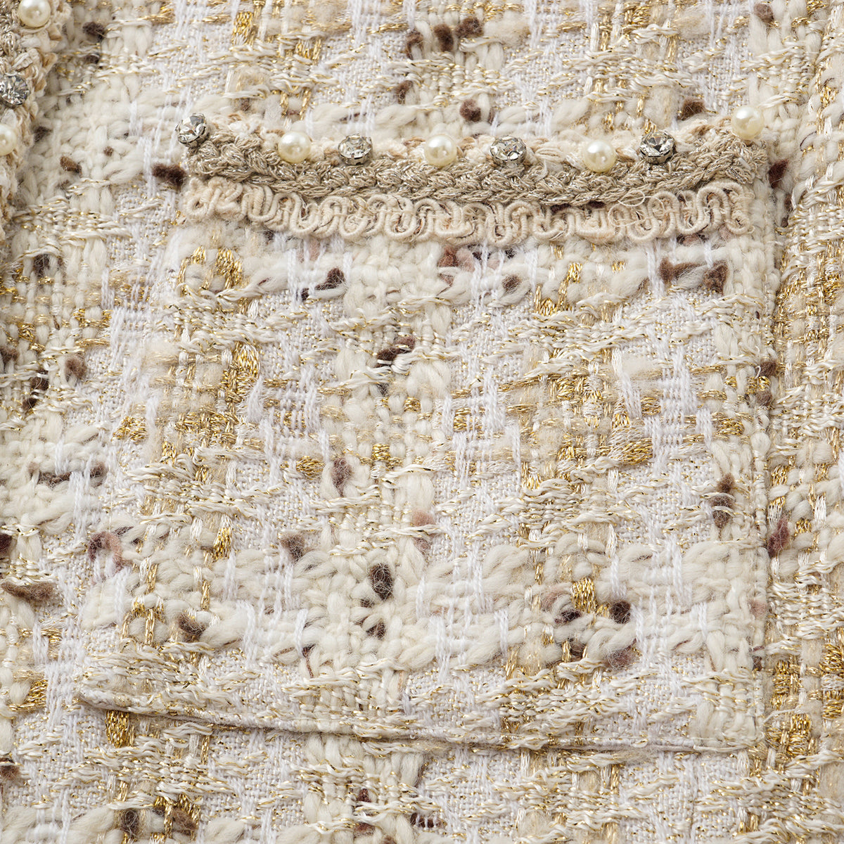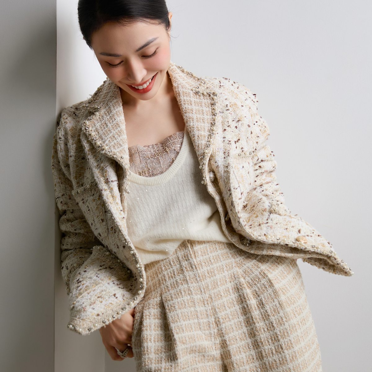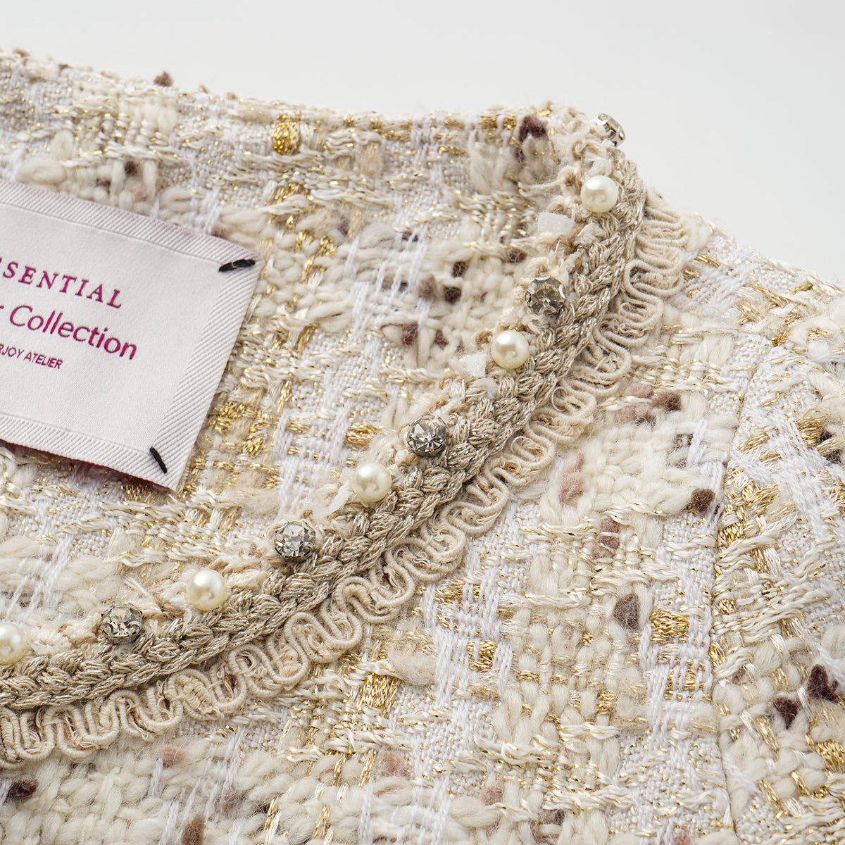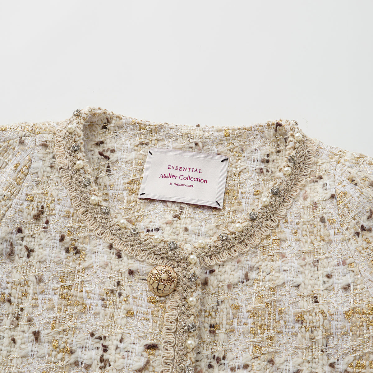 以法國經典花呢為基底,交織絲金光澤與立體織感。細緻的珍珠與水鑽點綴,將柔雅與華麗融於一體,展現如晨曦般溫潤而高貴的氛圍。