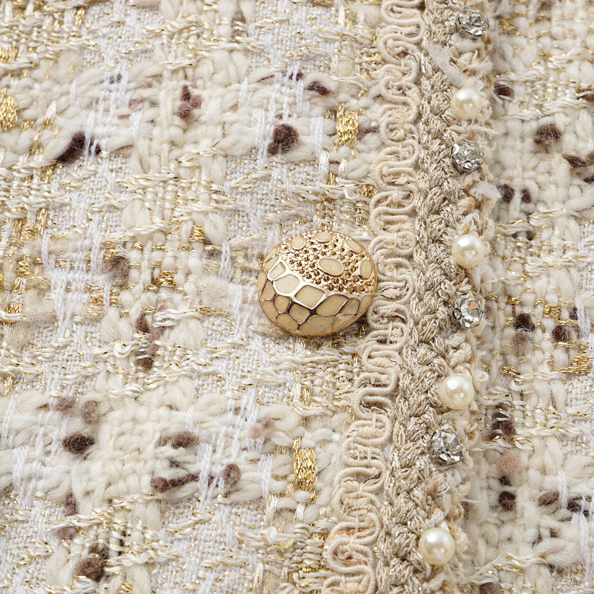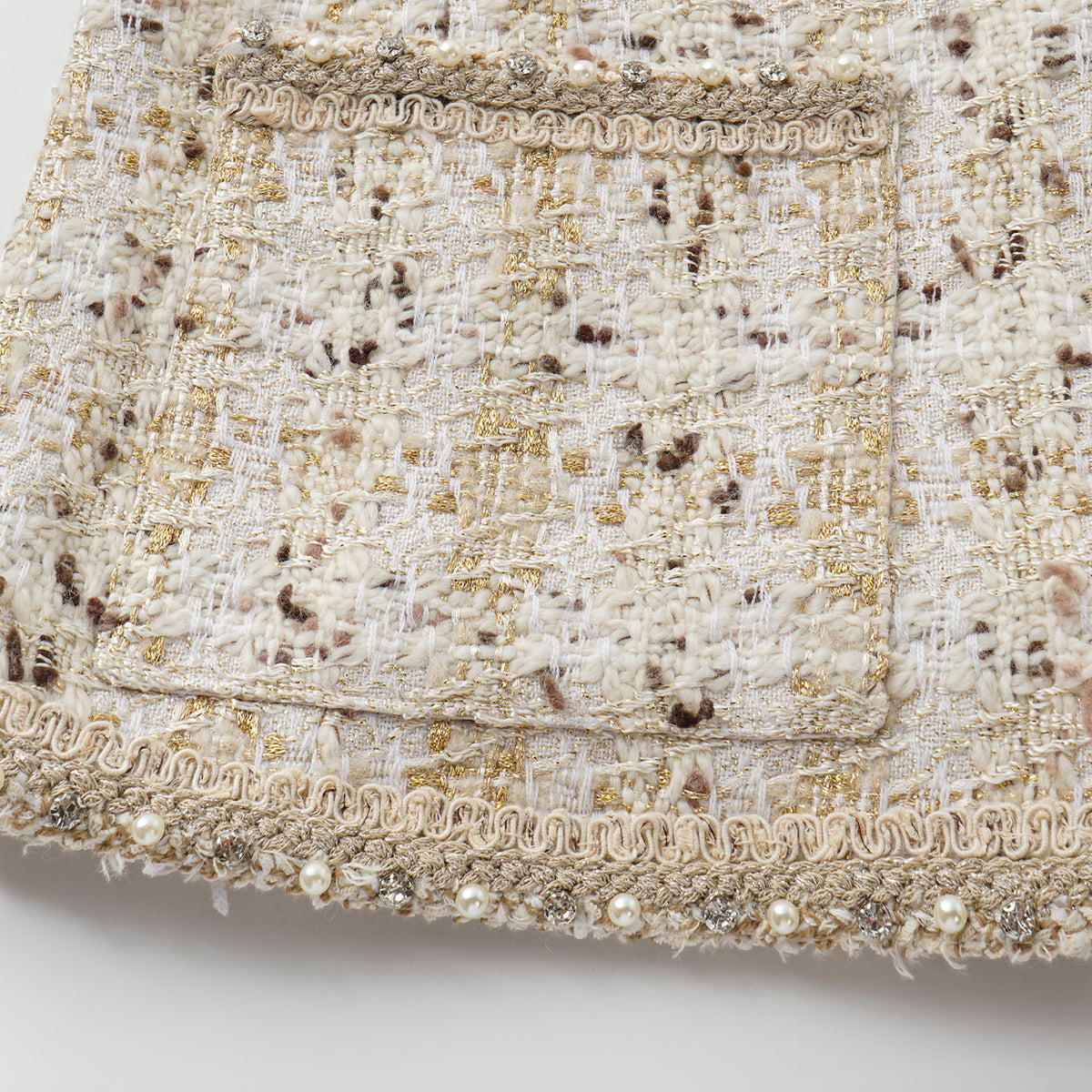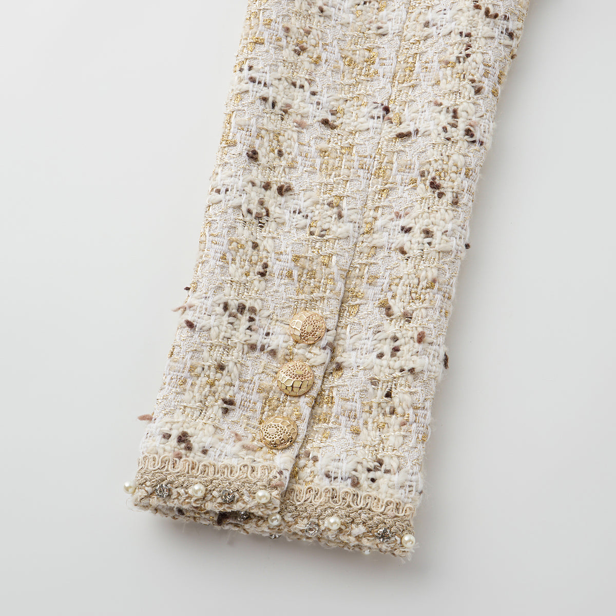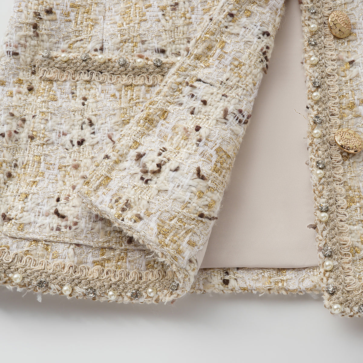 以法國經典花呢為基底,交織絲金光澤與立體織感。細緻的珍珠與水鑽點綴,將柔雅與華麗融於一體,展現如晨曦般溫潤而高貴的氛圍。