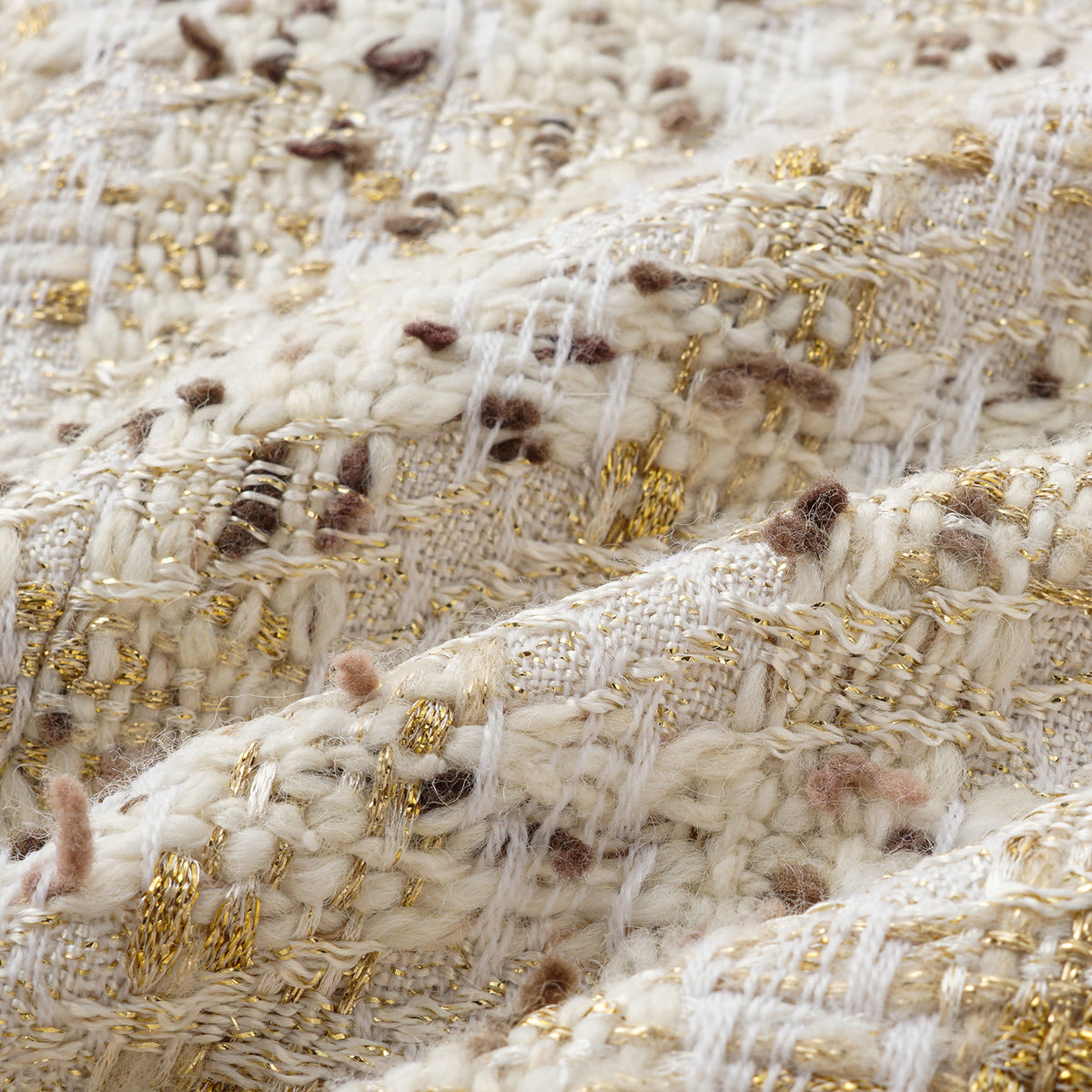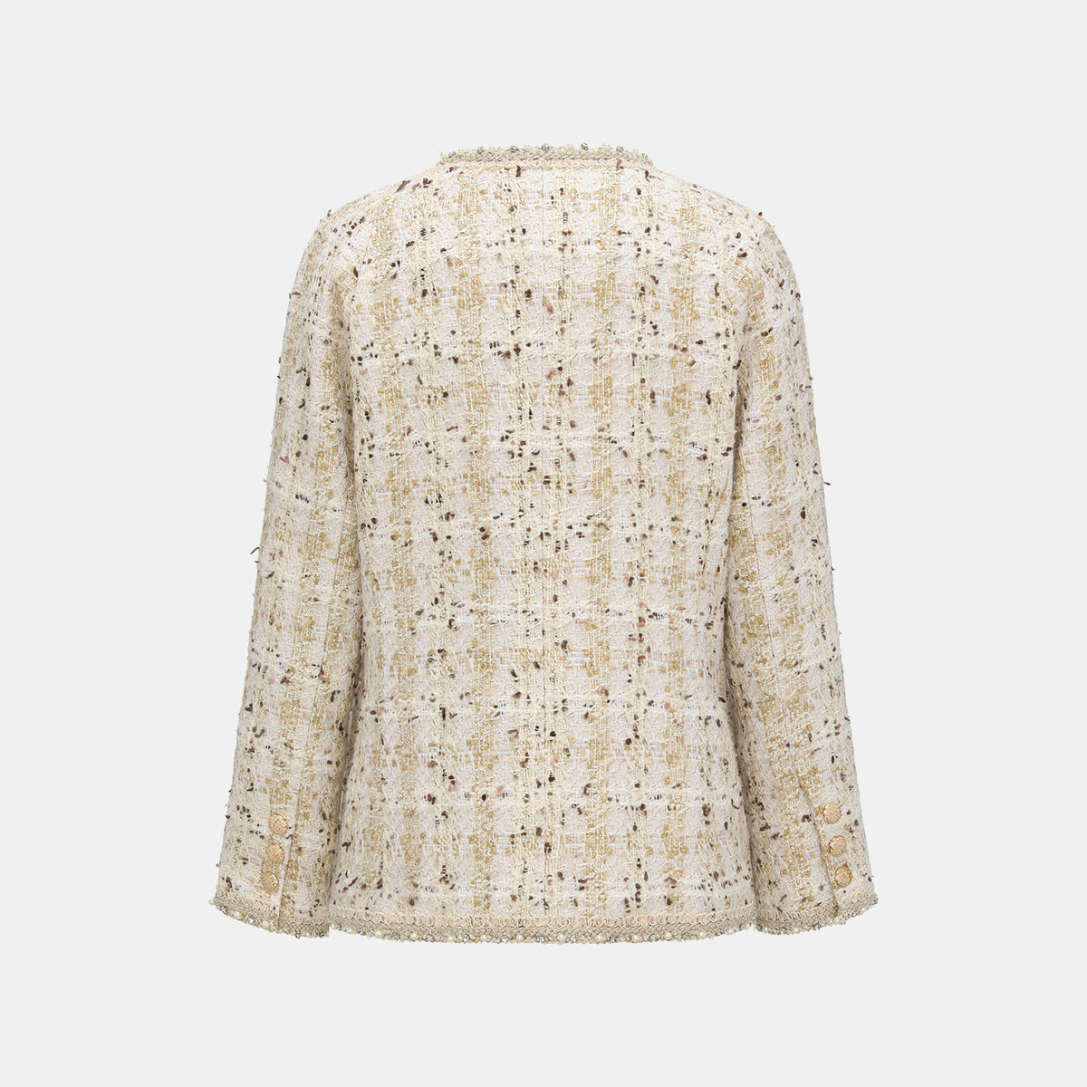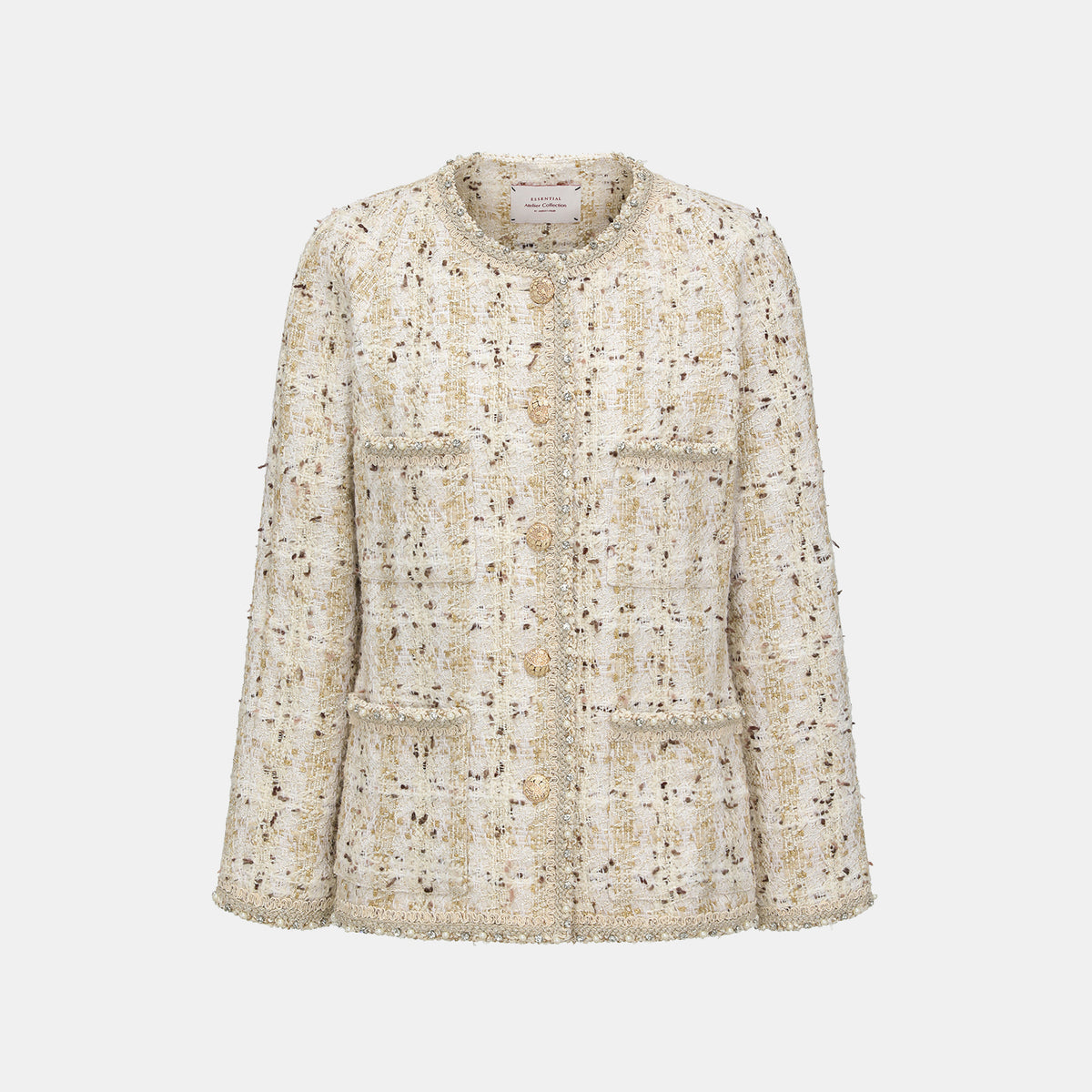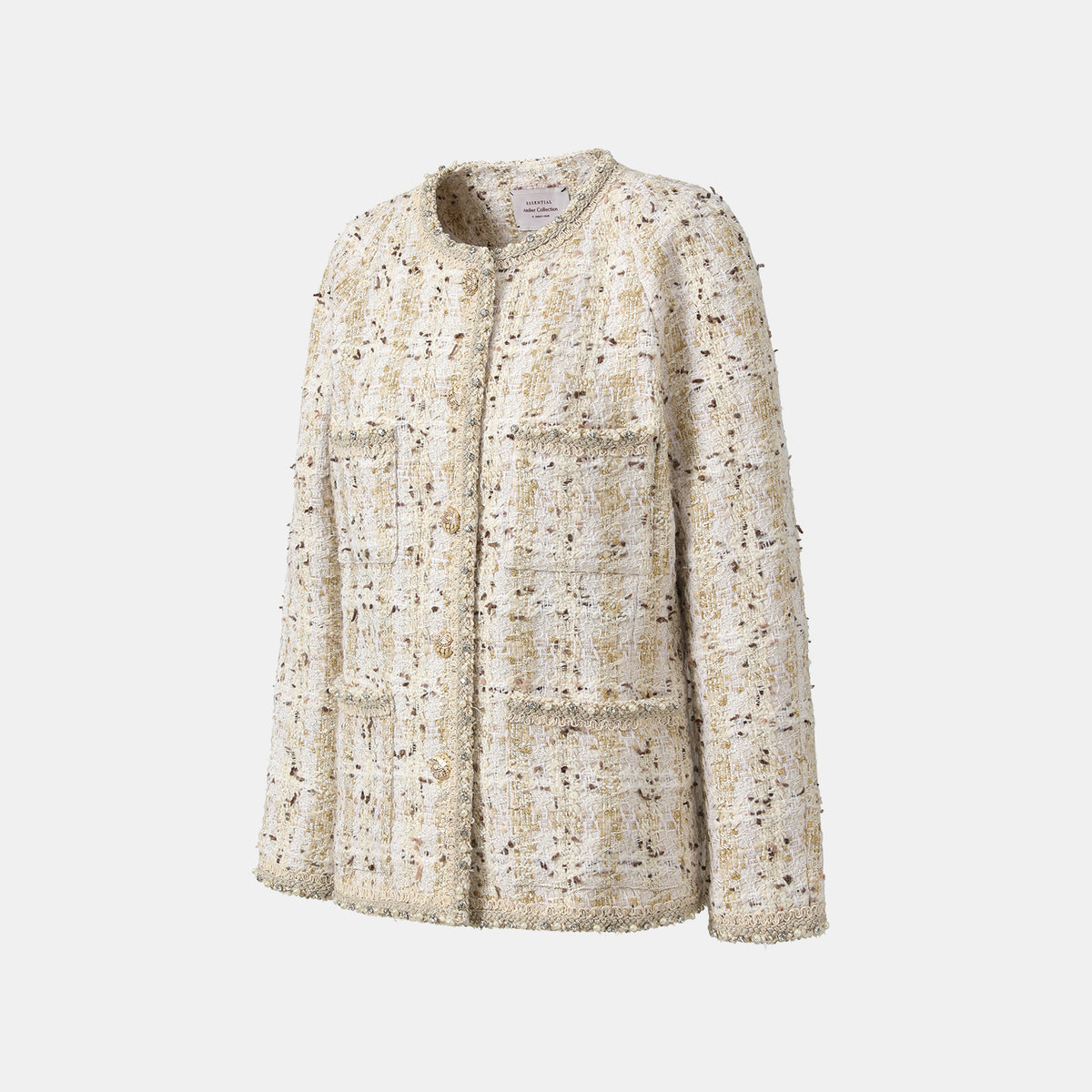 以法國經典花呢為基底,交織絲金光澤與立體織感。細緻的珍珠與水鑽點綴,將柔雅與華麗融於一體,展現如晨曦般溫潤而高貴的氛圍。