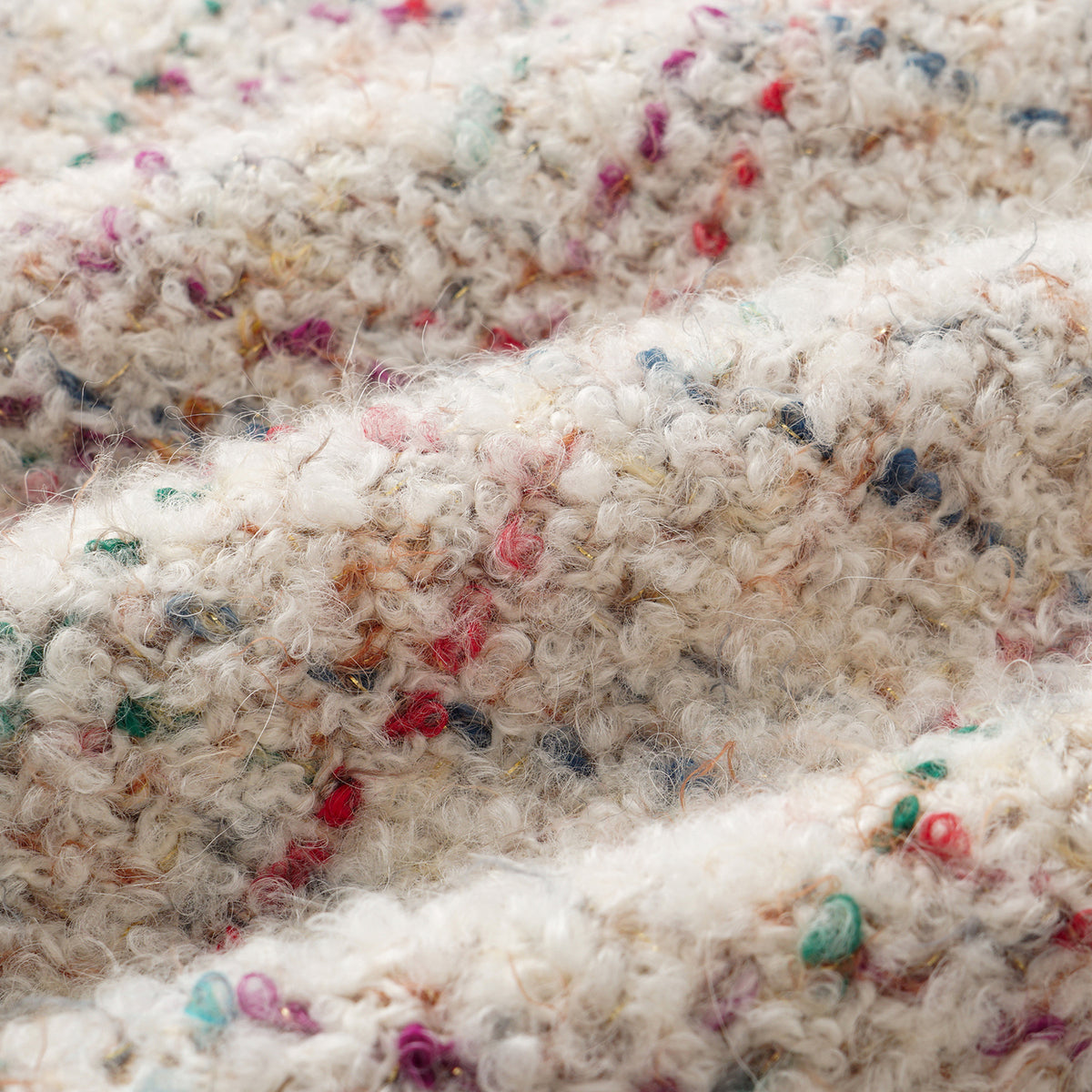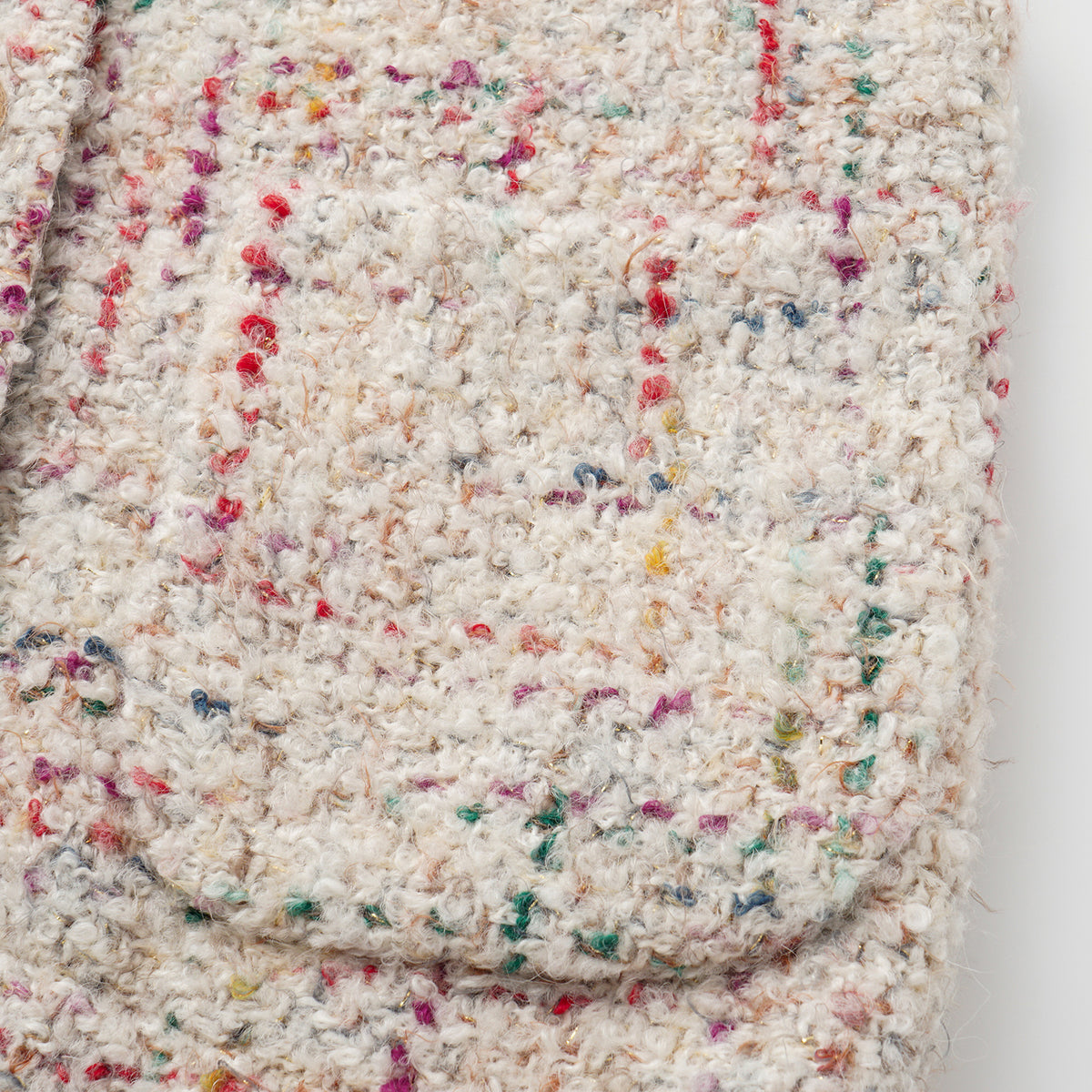 法國羊毛立體絨圈花呢交織出柔霧光澤,細緻絨粒間閃爍微色,如午後海風掠過石牆般溫柔。觸感柔軟卻富有層次,展現低調而詩意的奢華氣息