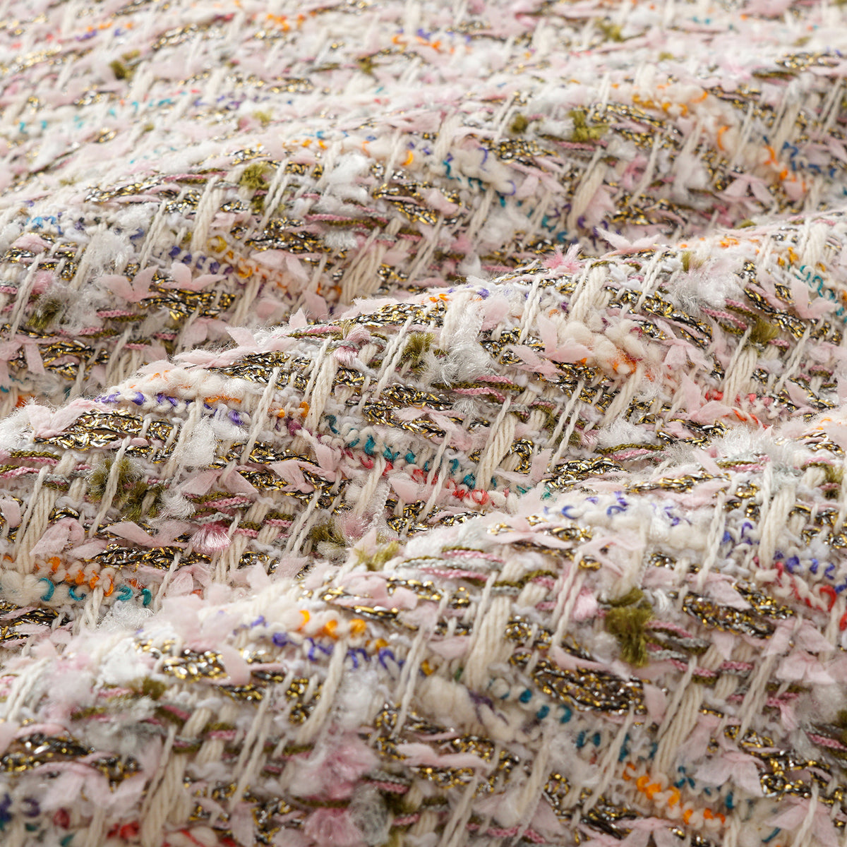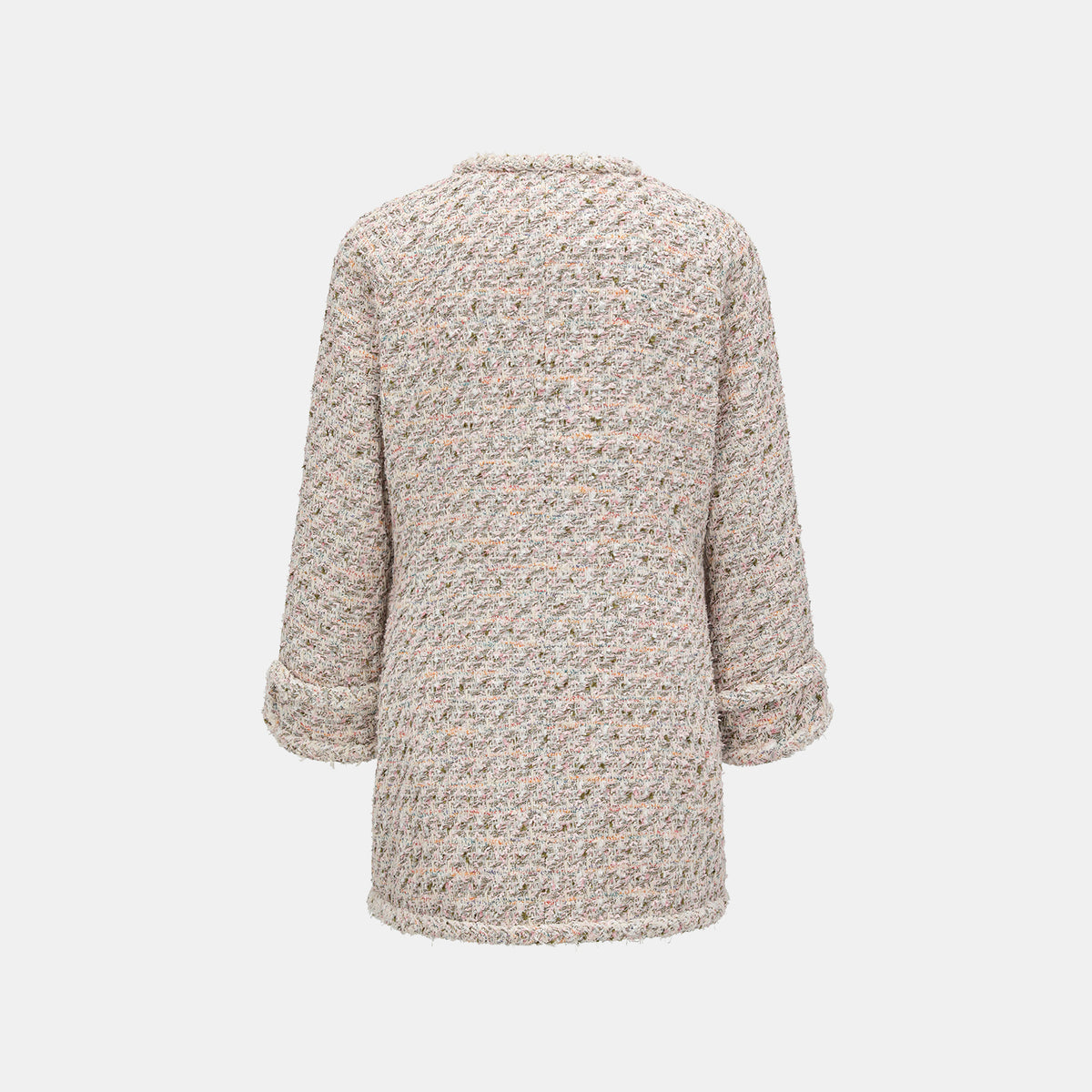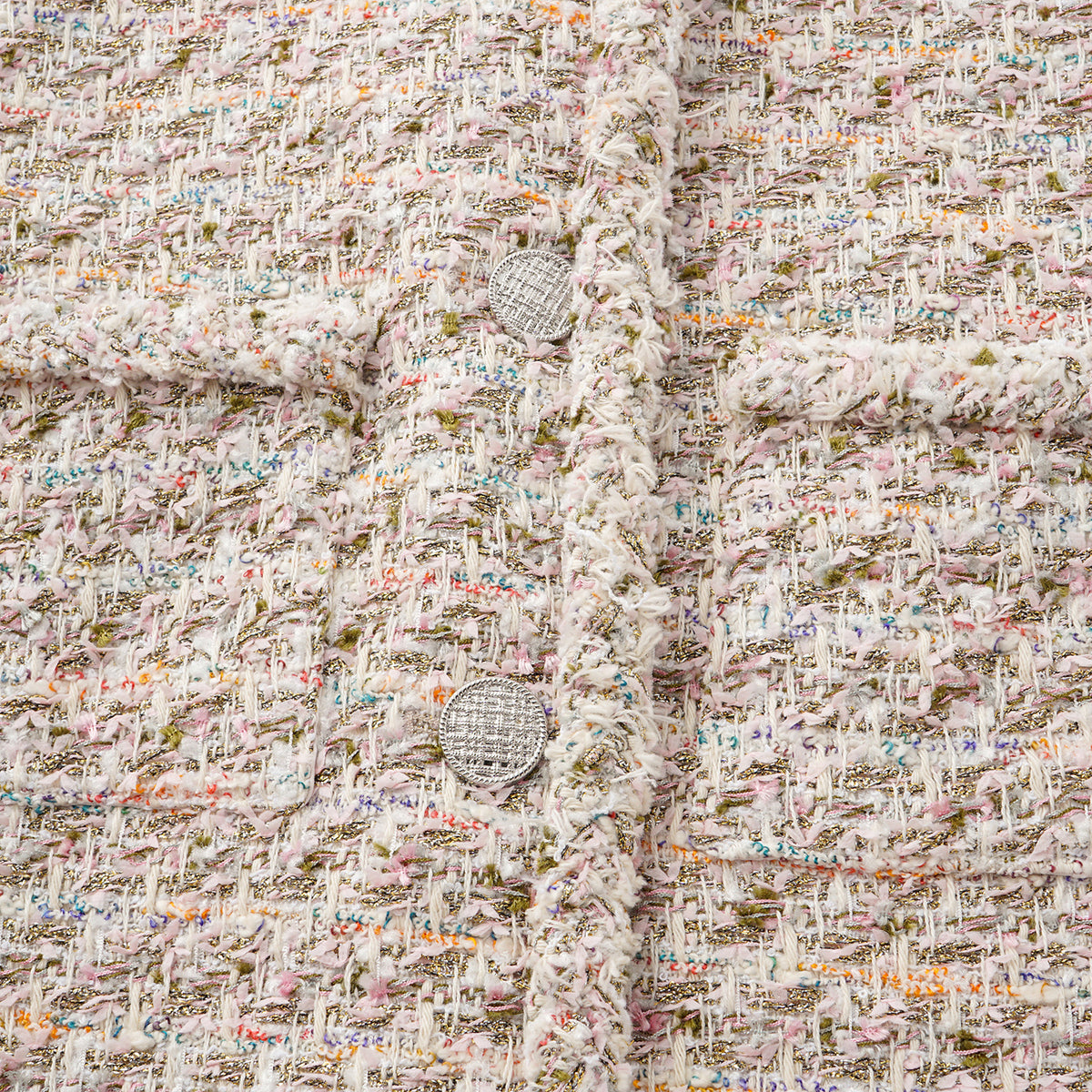 以細緻花呢立體布料編織而成,柔軟紗線交織細閃金屬纖維,隨光映出午後般的溫潤霧光。層次細膩、觸感柔糯,在靜謐光影間綻放優雅與輕奢。