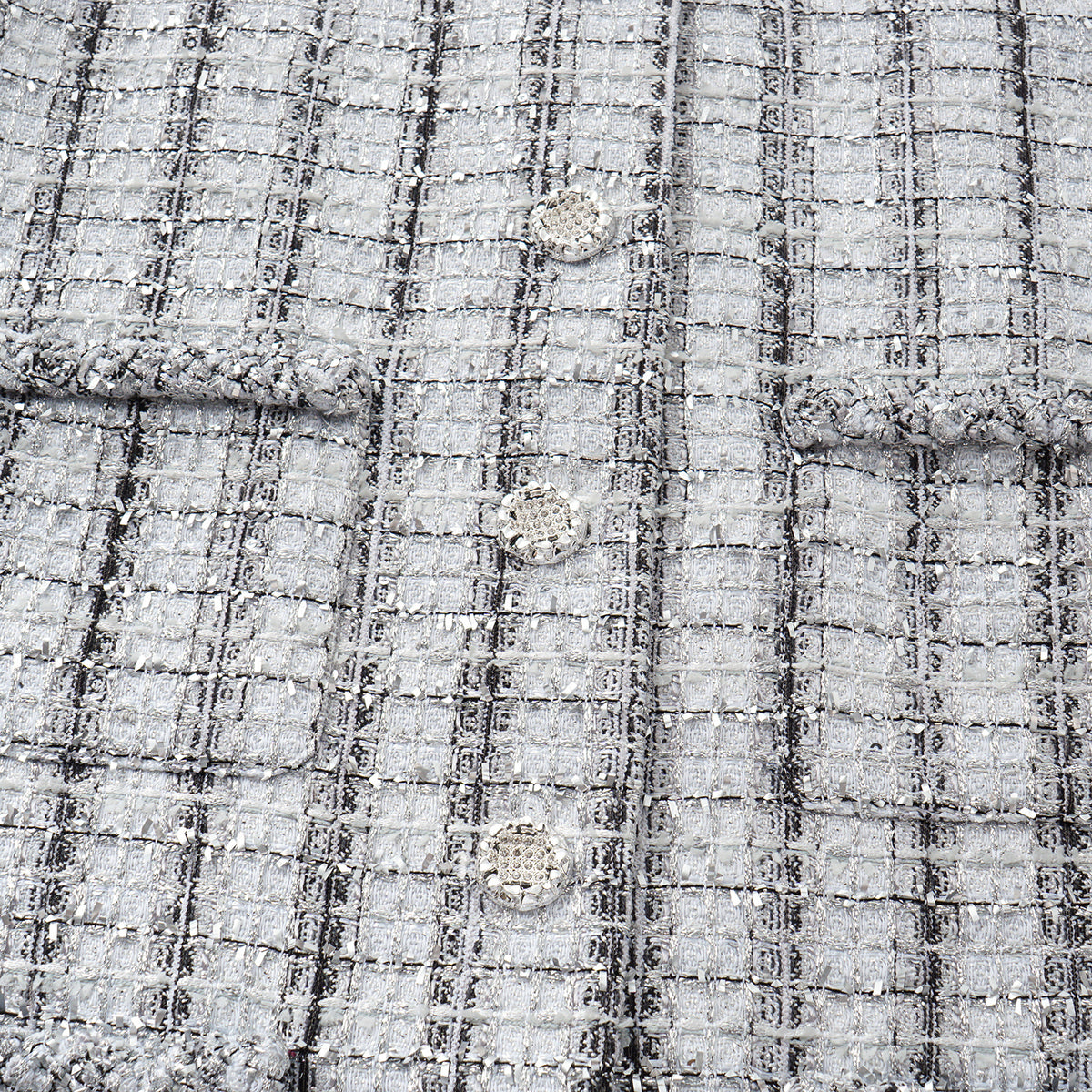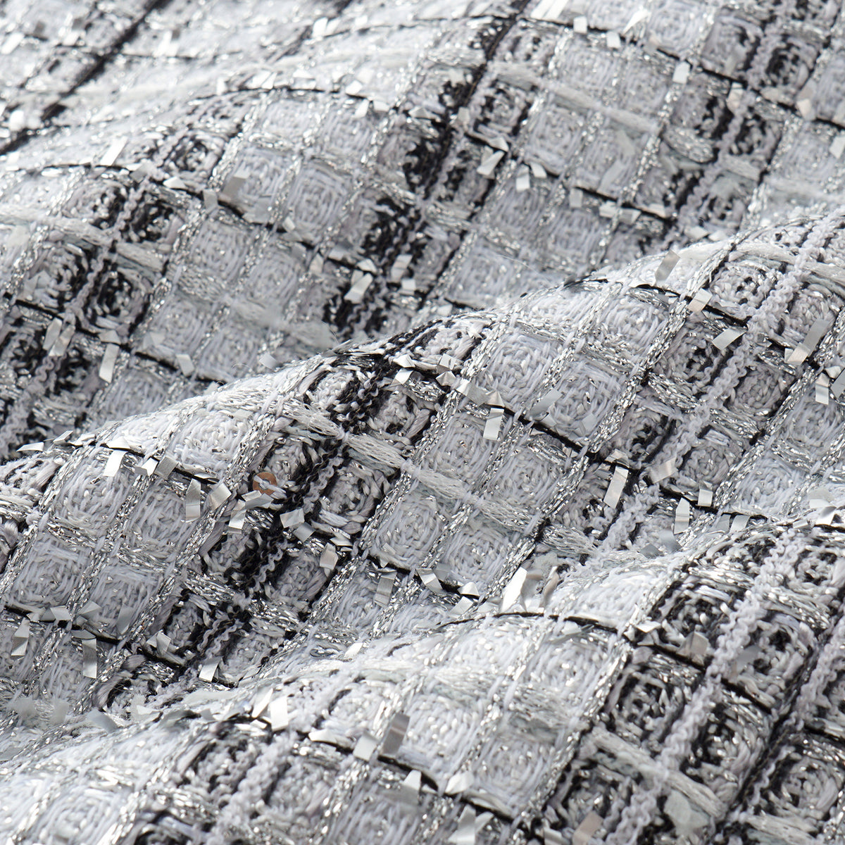 法國頂級蕾絲花呢,縷金與銀燦交織出細膩層次,柔軟中透出光影質感。布理厚實卻輕盈,細緻手感如晨霧覆光,優雅閃爍,展現極致工藝與詩意溫度。