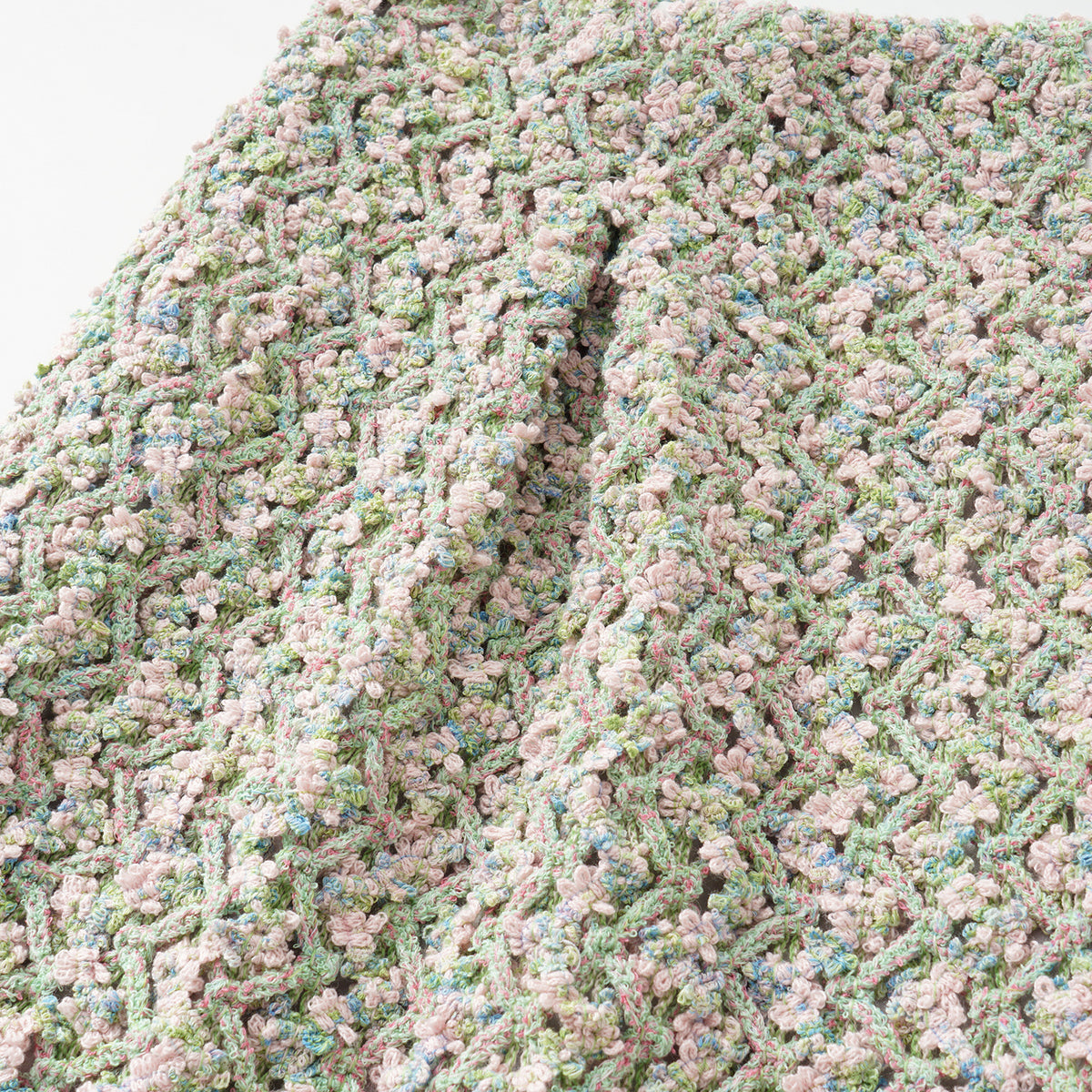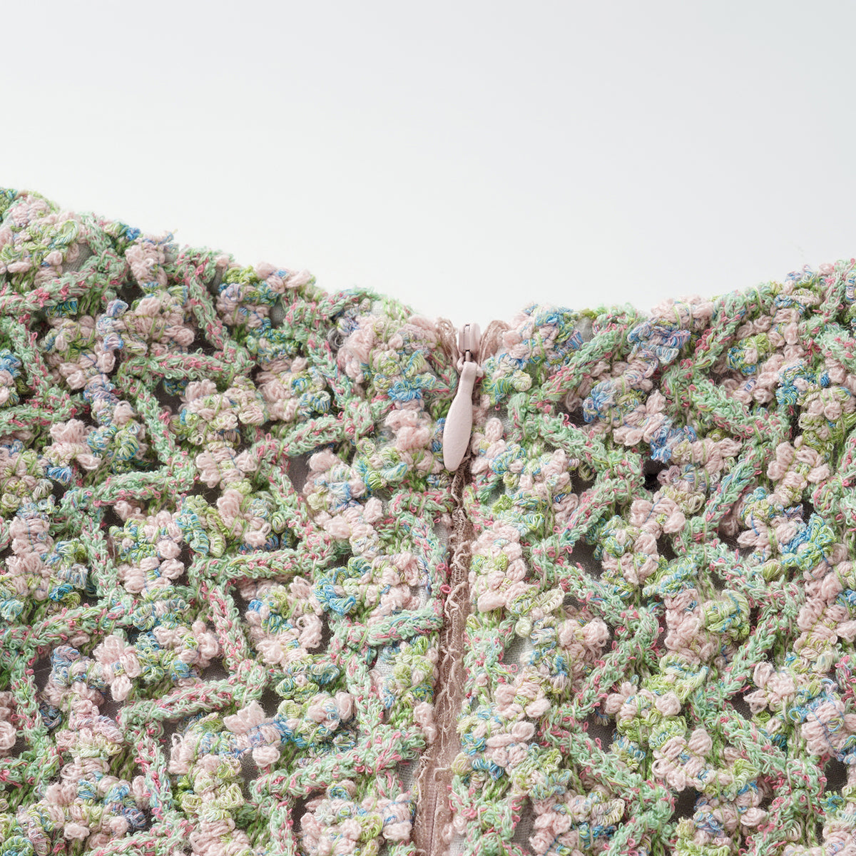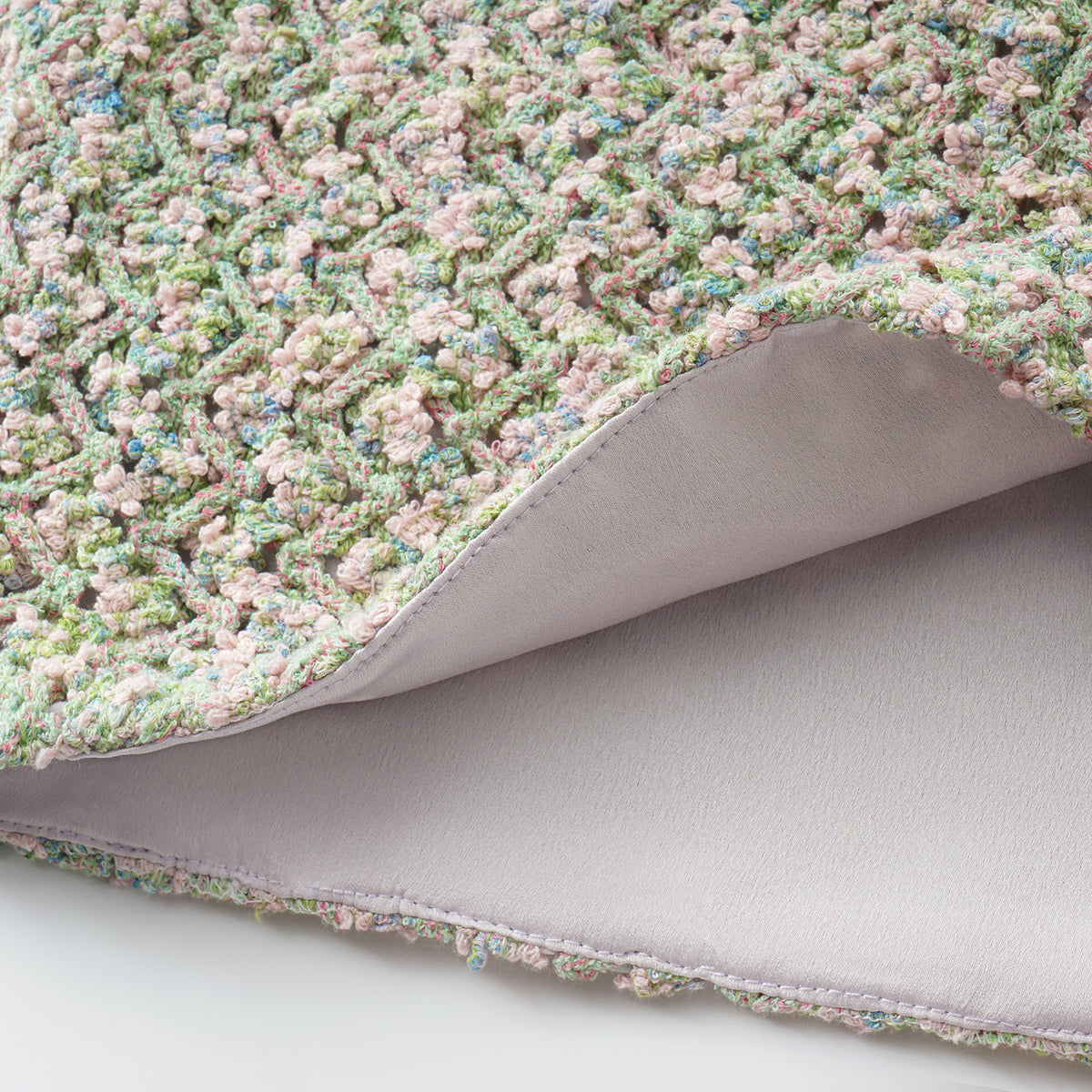 柔霧般的花呢布面交織綠、粉與藍紫細語,光影流轉間閃爍細密層次。質地柔軟卻富立體感,帶著自然脈動與水波的靜謐詩意,散發溫潤與夢幻的氣息。