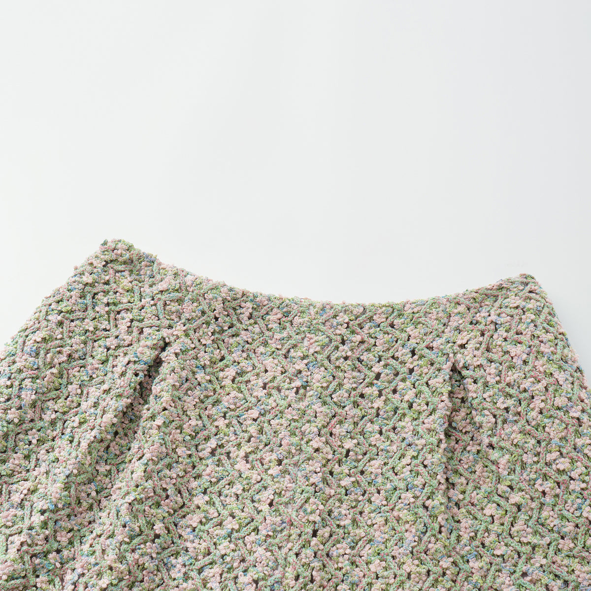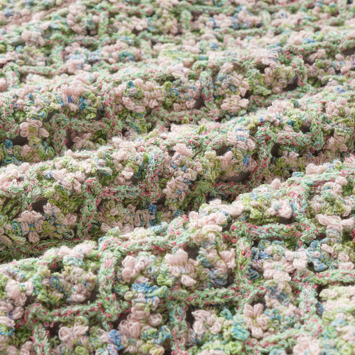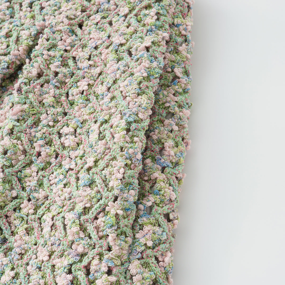 柔霧般的花呢布面交織綠、粉與藍紫細語,光影流轉間閃爍細密層次。質地柔軟卻富立體感,帶著自然脈動與水波的靜謐詩意,散發溫潤與夢幻的氣息。