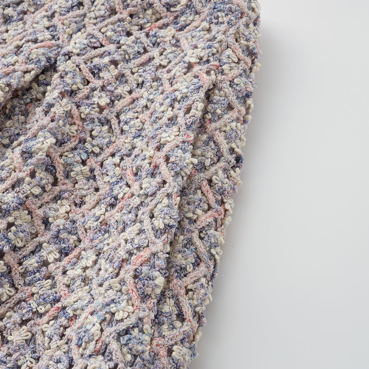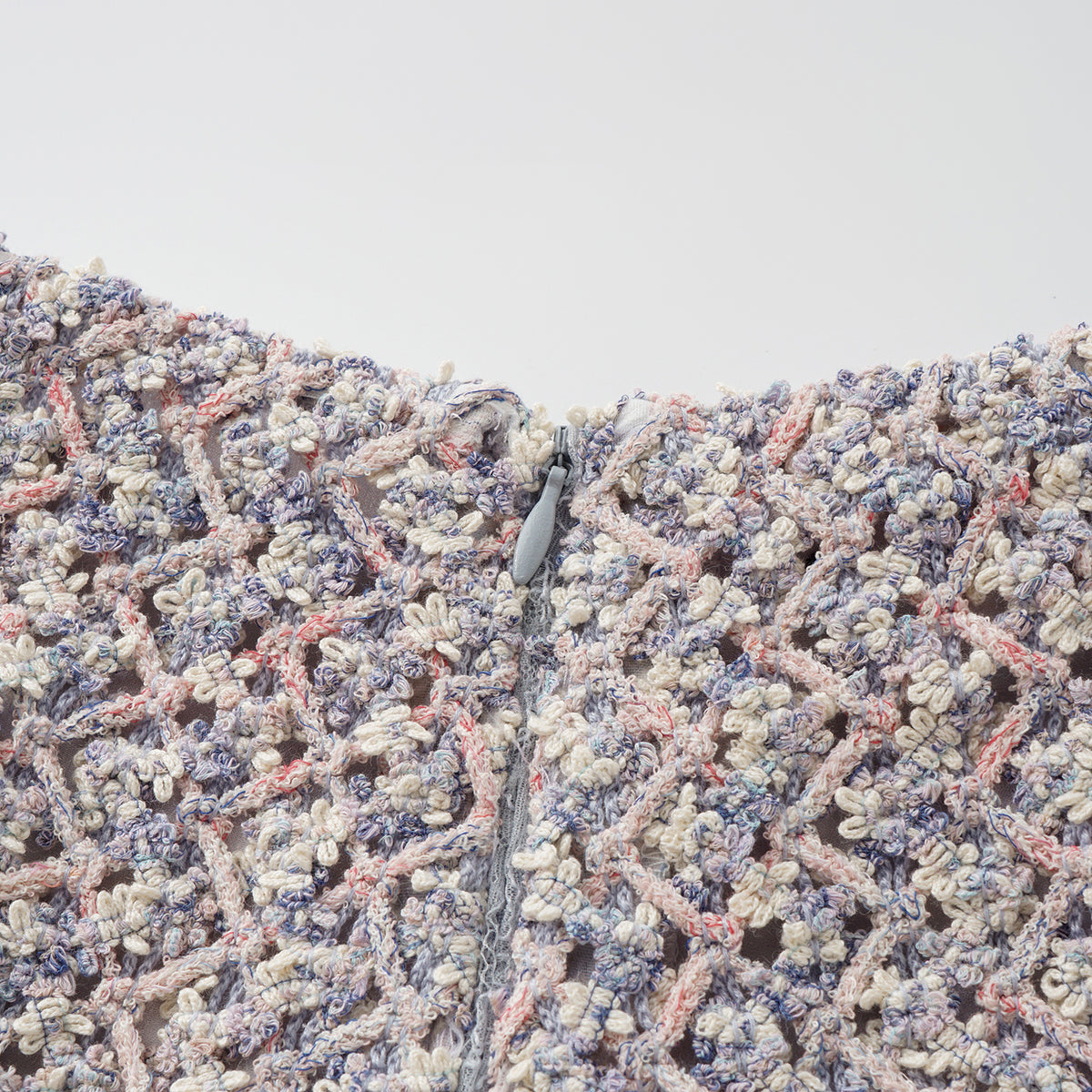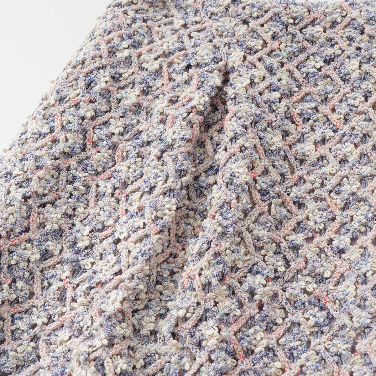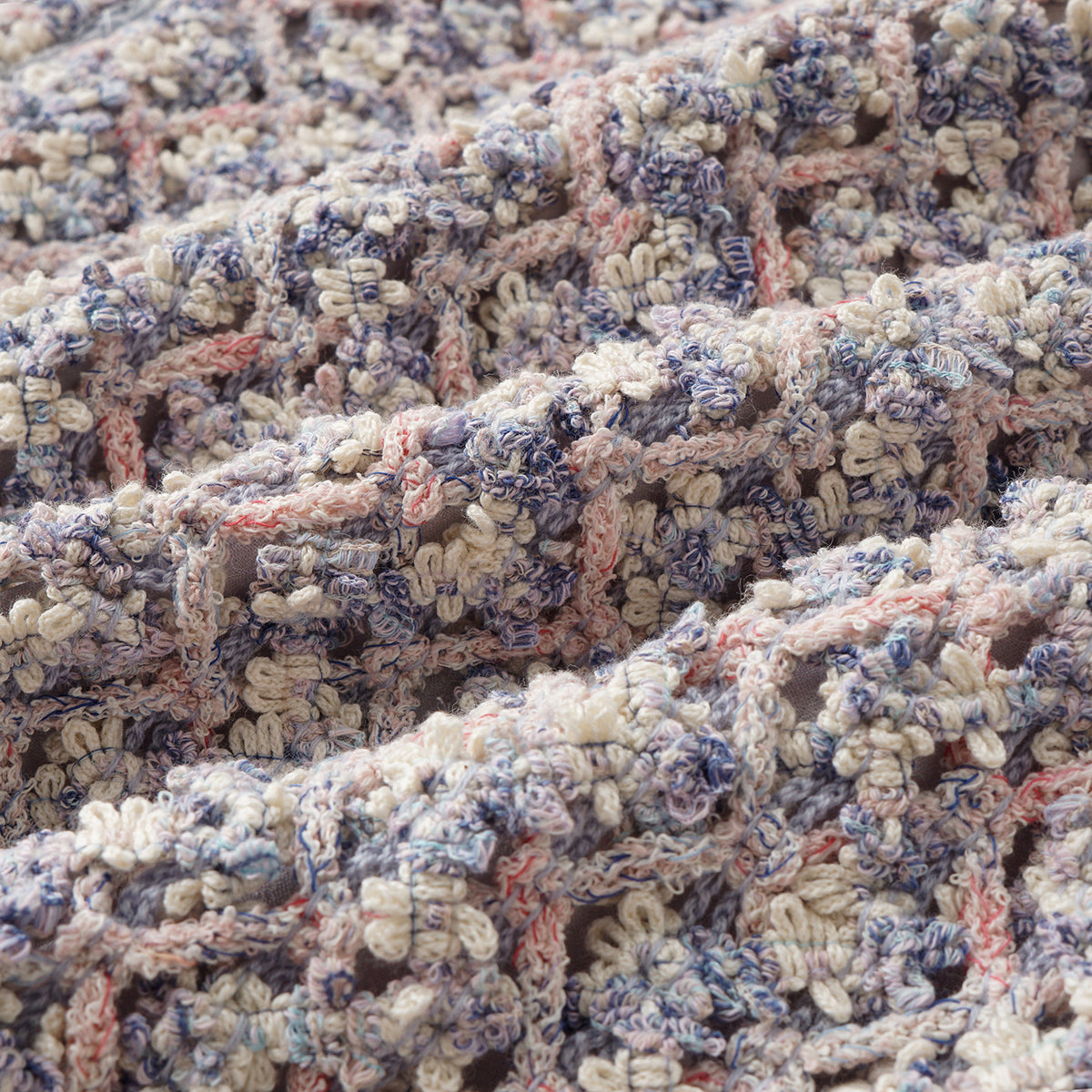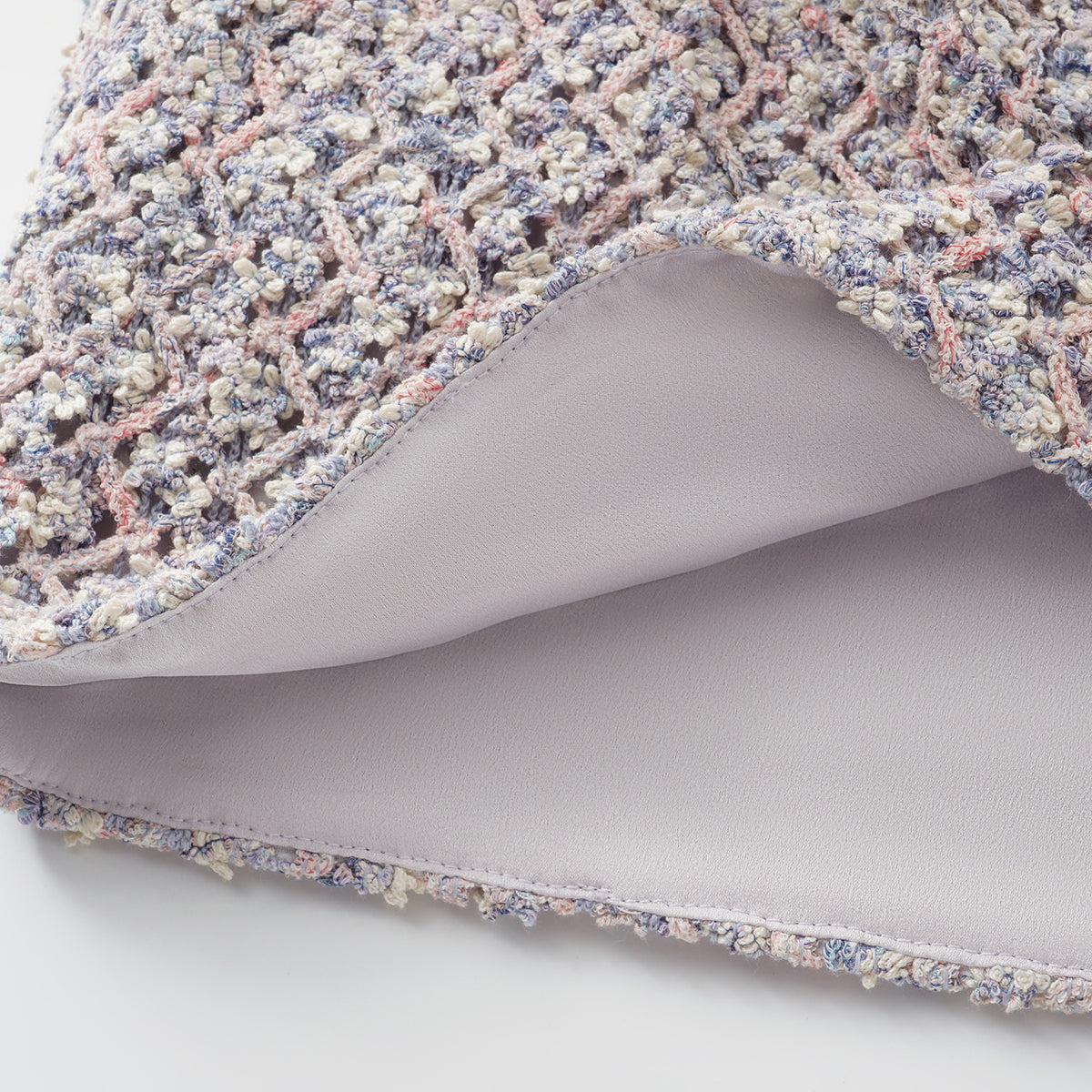 柔霧般的花呢布面交織綠、粉與藍紫細語,光影流轉間閃爍細密層次。質地柔軟卻富立體感,帶著自然脈動與水波的靜謐詩意,散發溫潤與夢幻的氣息。