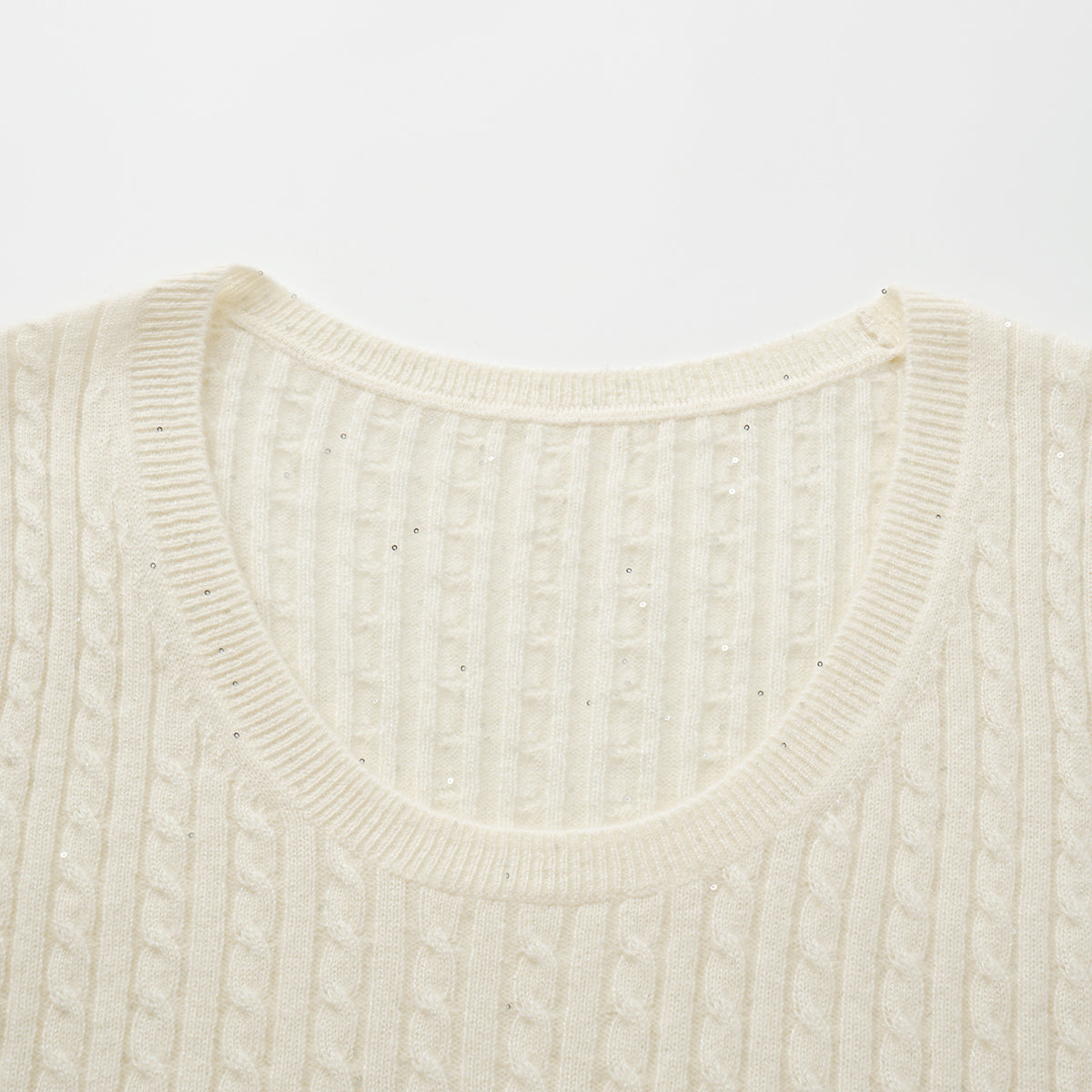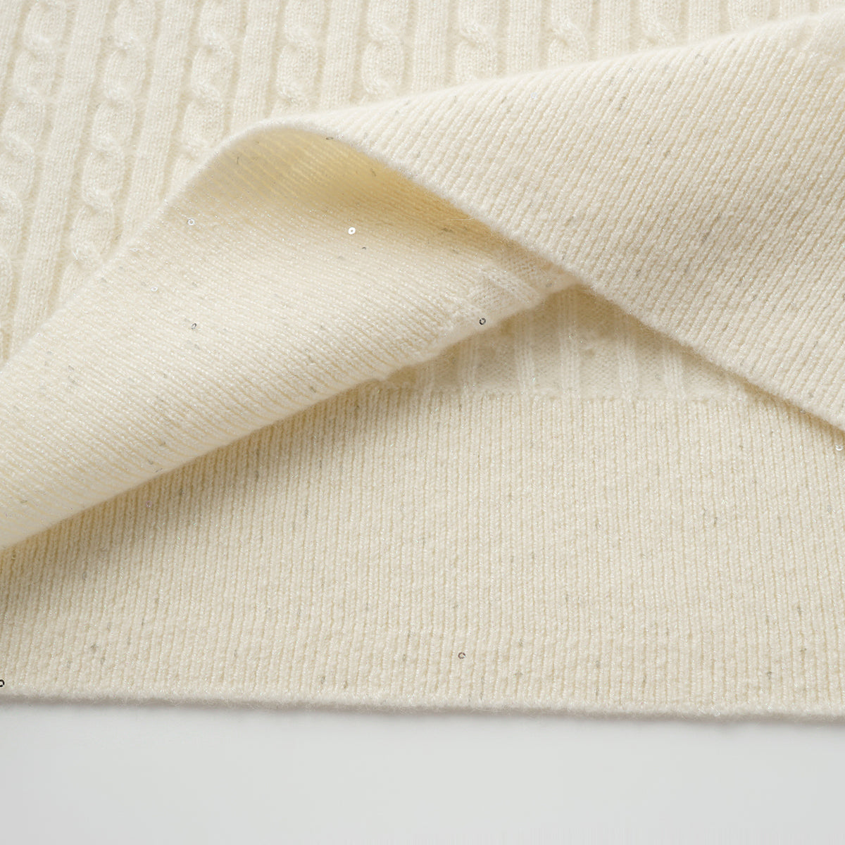 100% 山羊絨觸感柔軟細膩,保暖卻輕盈。麻花編織層次立體,細緻亮片點綴如星光閃耀,展現溫柔質感,將舒適與浪漫完美融合。
