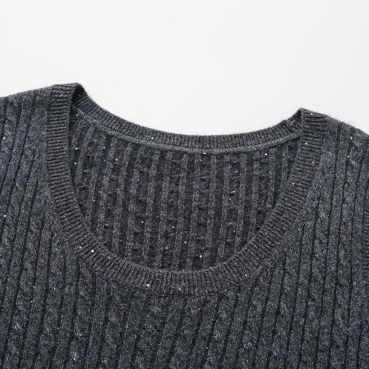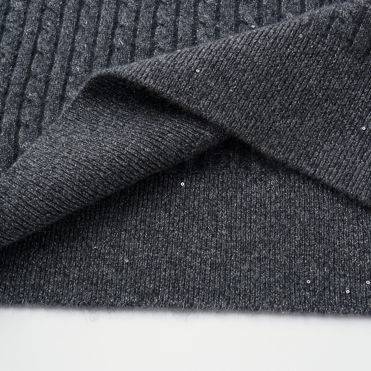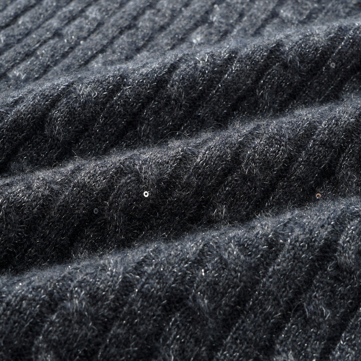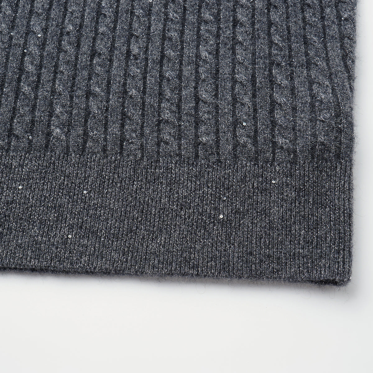 100% 山羊絨觸感柔軟細膩,保暖卻輕盈。麻花編織層次立體,細緻亮片點綴如星光閃耀,展現溫柔質感,將舒適與浪漫完美融合。