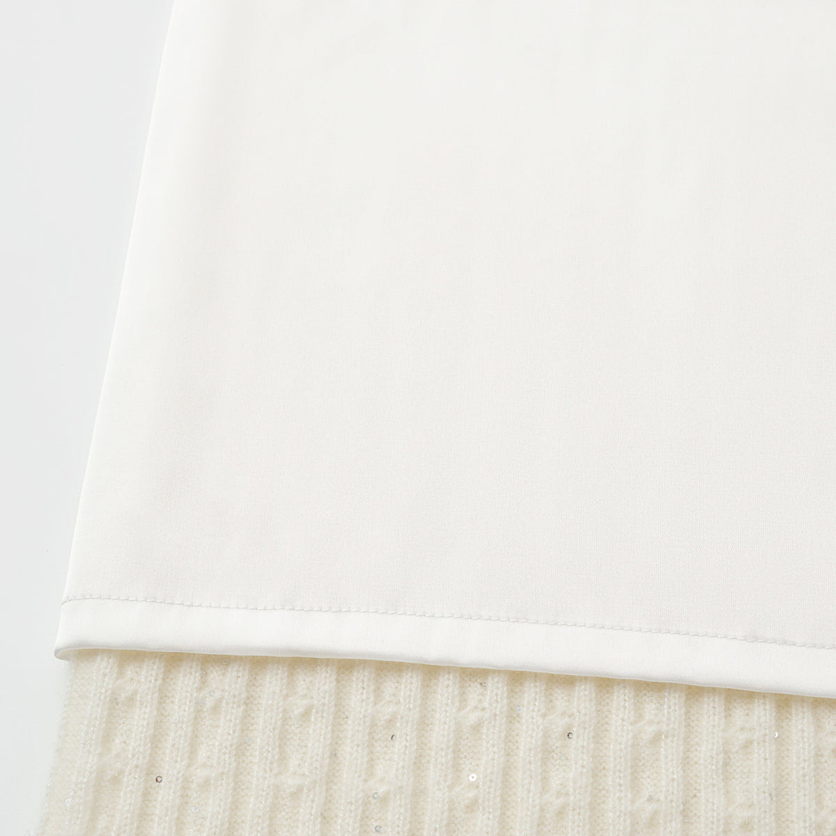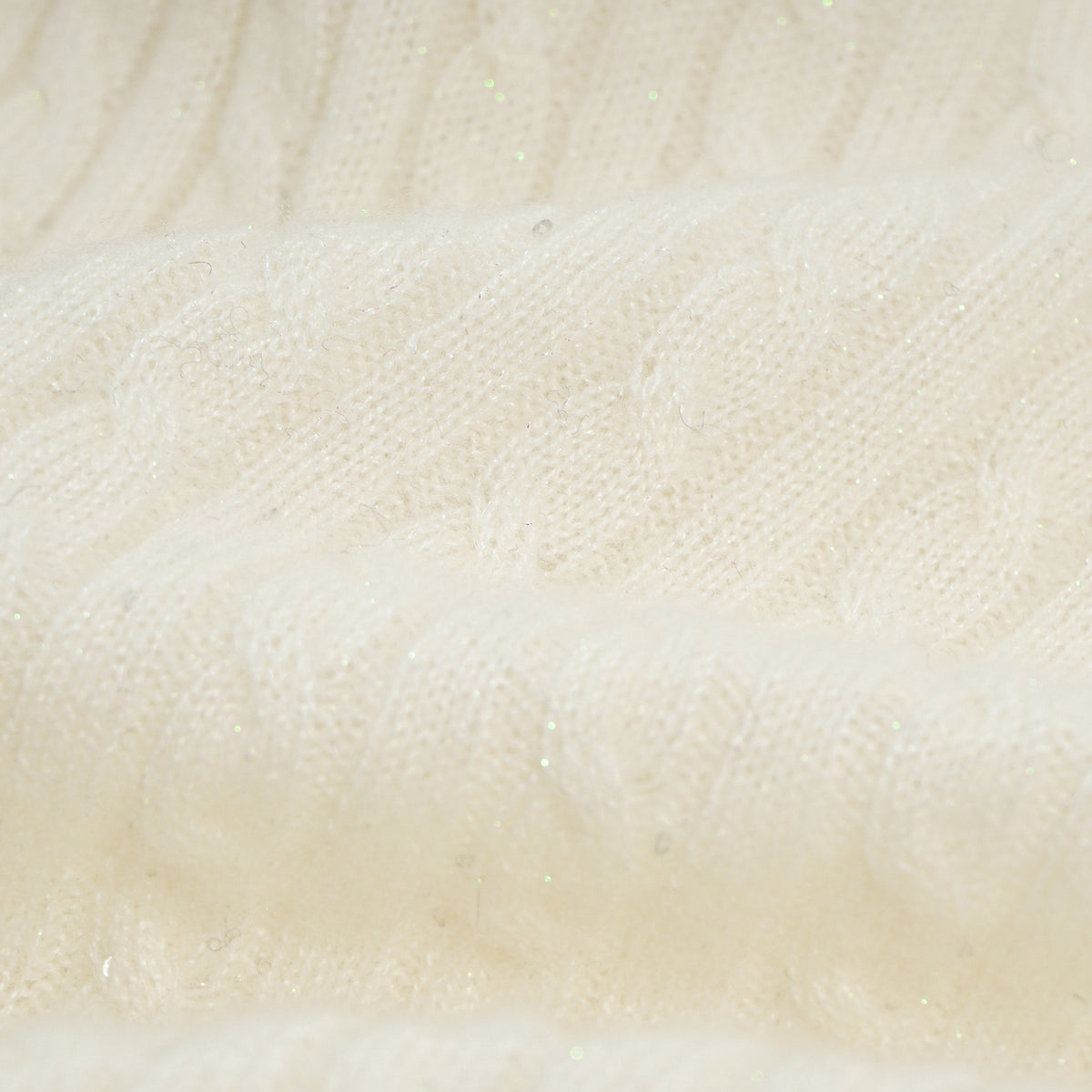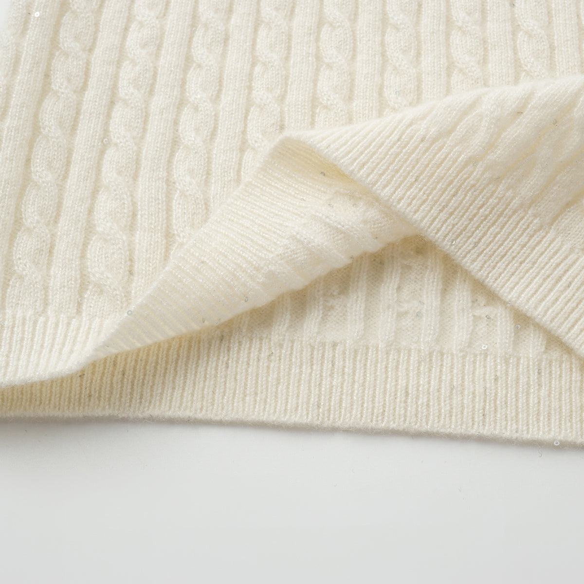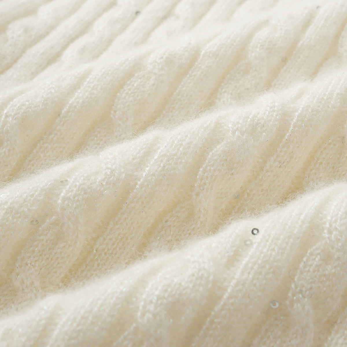 100% 山羊絨觸感柔軟細膩,保暖卻輕盈。麻花編織層次立體,細緻亮片點綴如星光閃耀,展現溫柔質感,將舒適與浪漫完美融合。
