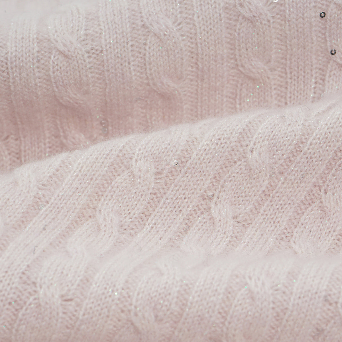 100% 山羊絨觸感柔軟細膩,保暖卻輕盈。麻花編織層次立體,細緻亮片點綴如星光閃耀,展現溫柔質感,將舒適與浪漫完美融合。
