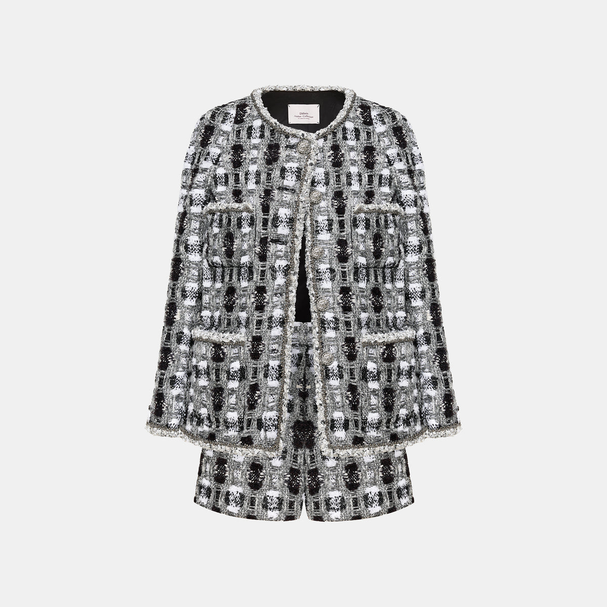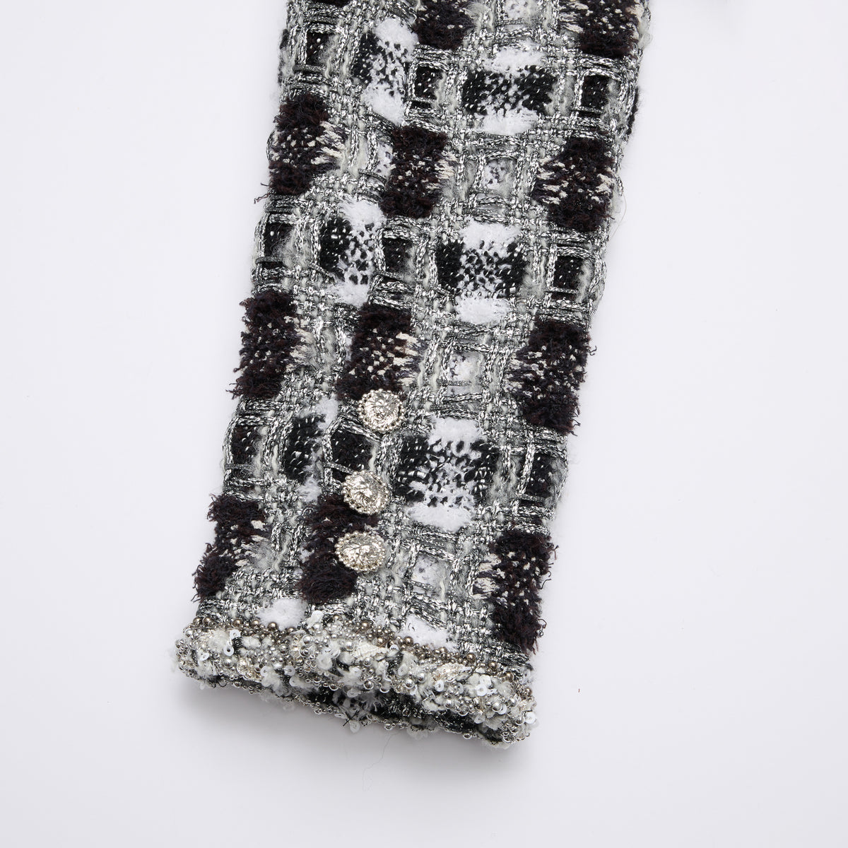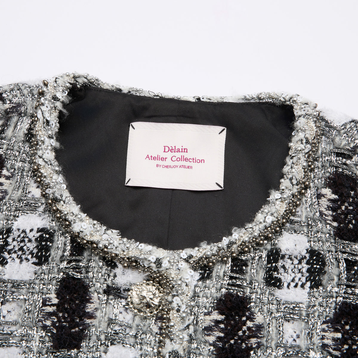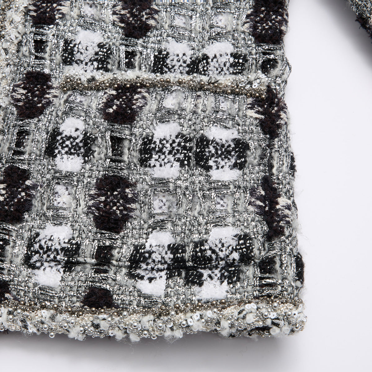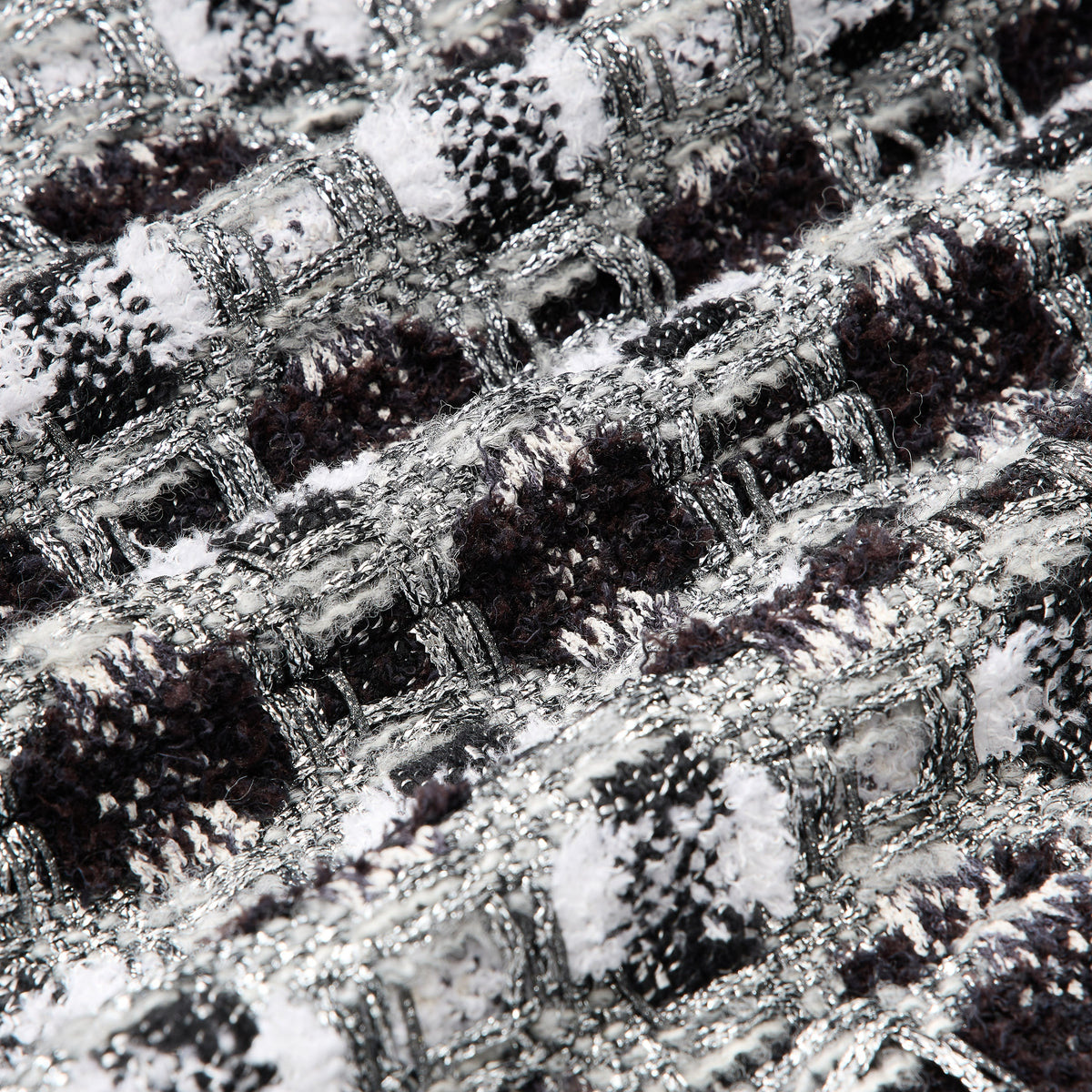 法國銀織嵌線繡藝花呢,細密銀絲交錯於經典格紋之中,形成層次分明的立體肌理。黑白色調在光影下流動,柔軟絮感中保有結構重量,展現低調而精緻的夜色質感。