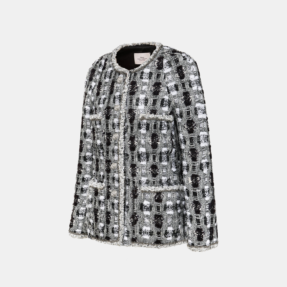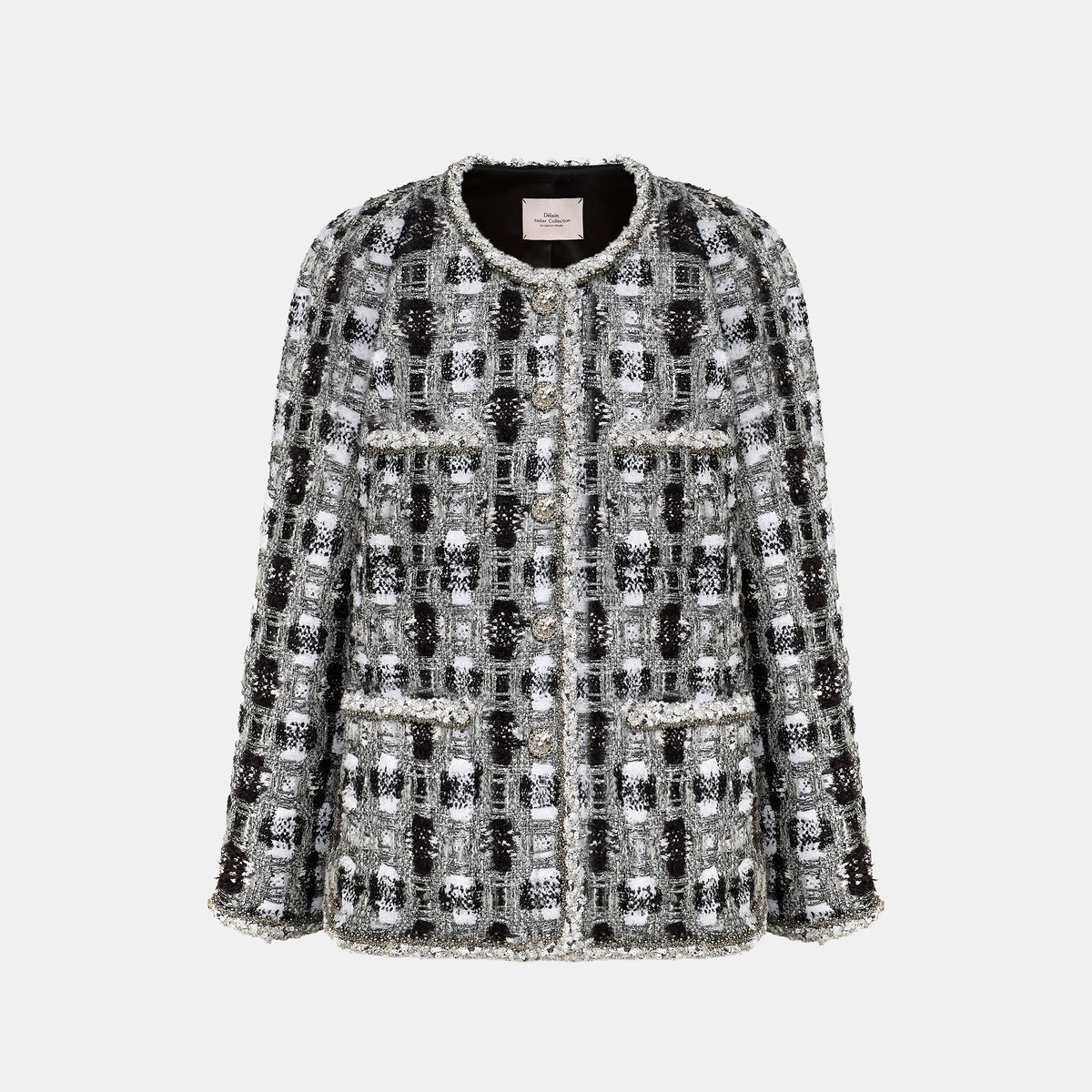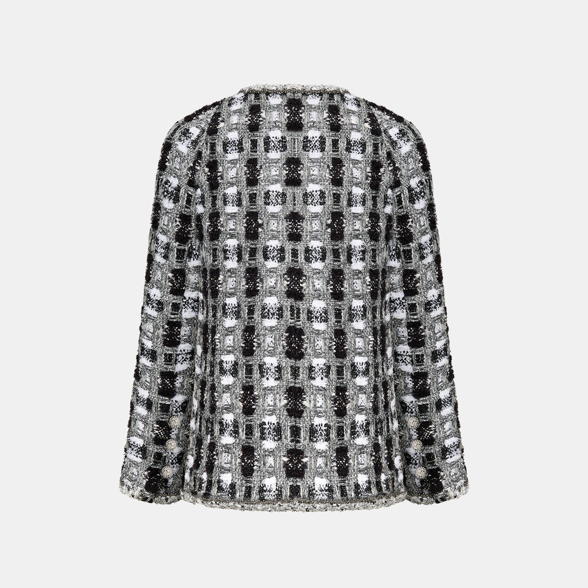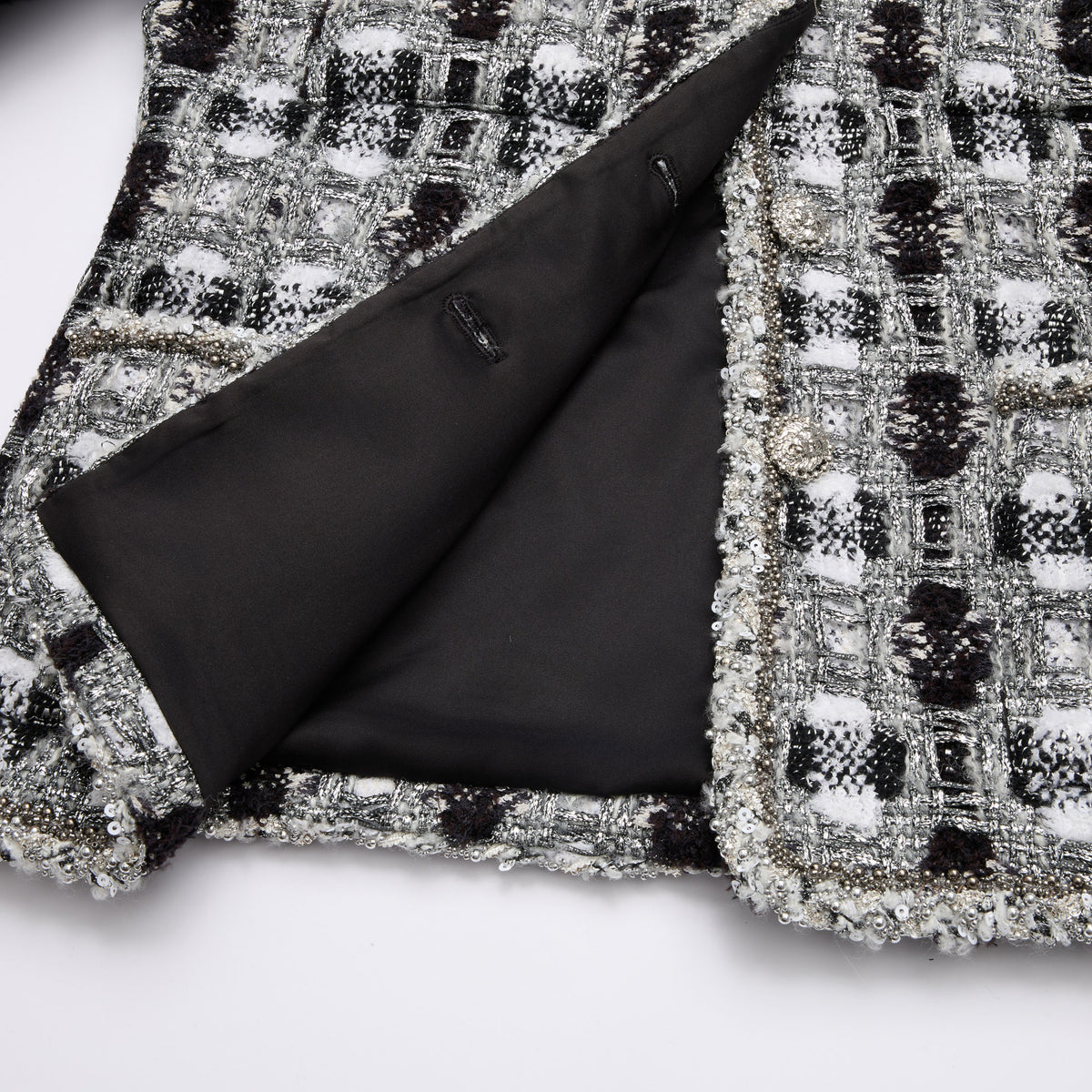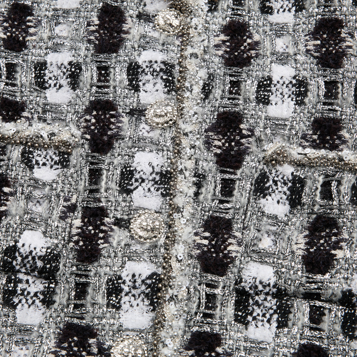 法國銀織嵌線繡藝花呢,細密銀絲交錯於經典格紋之中,形成層次分明的立體肌理。黑白色調在光影下流動,柔軟絮感中保有結構重量,展現低調而精緻的夜色質感。
