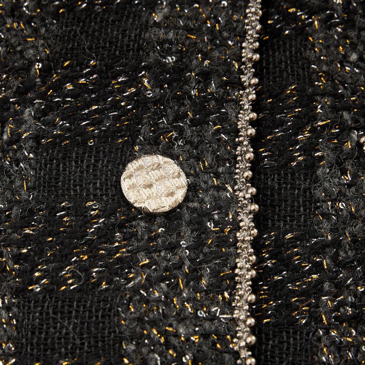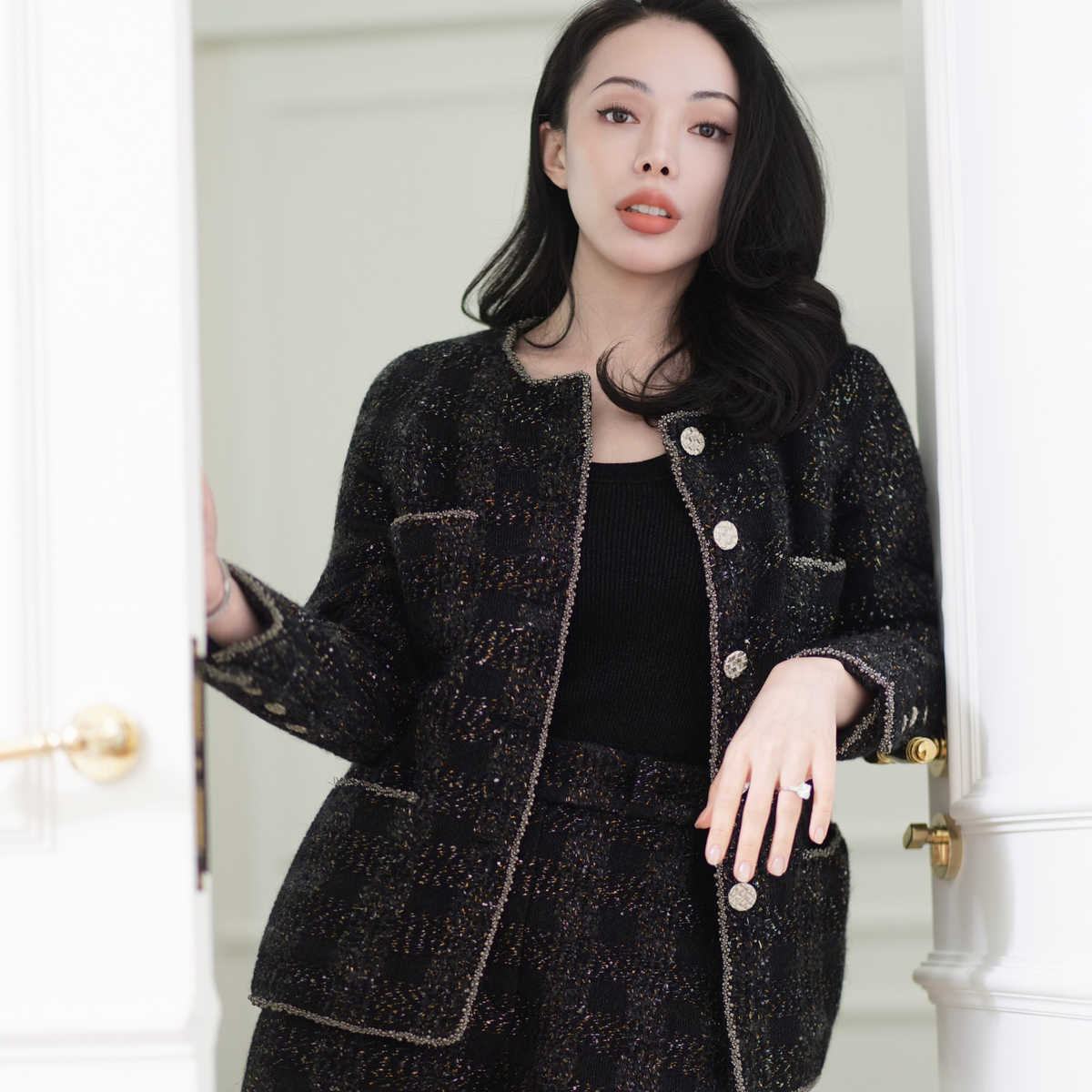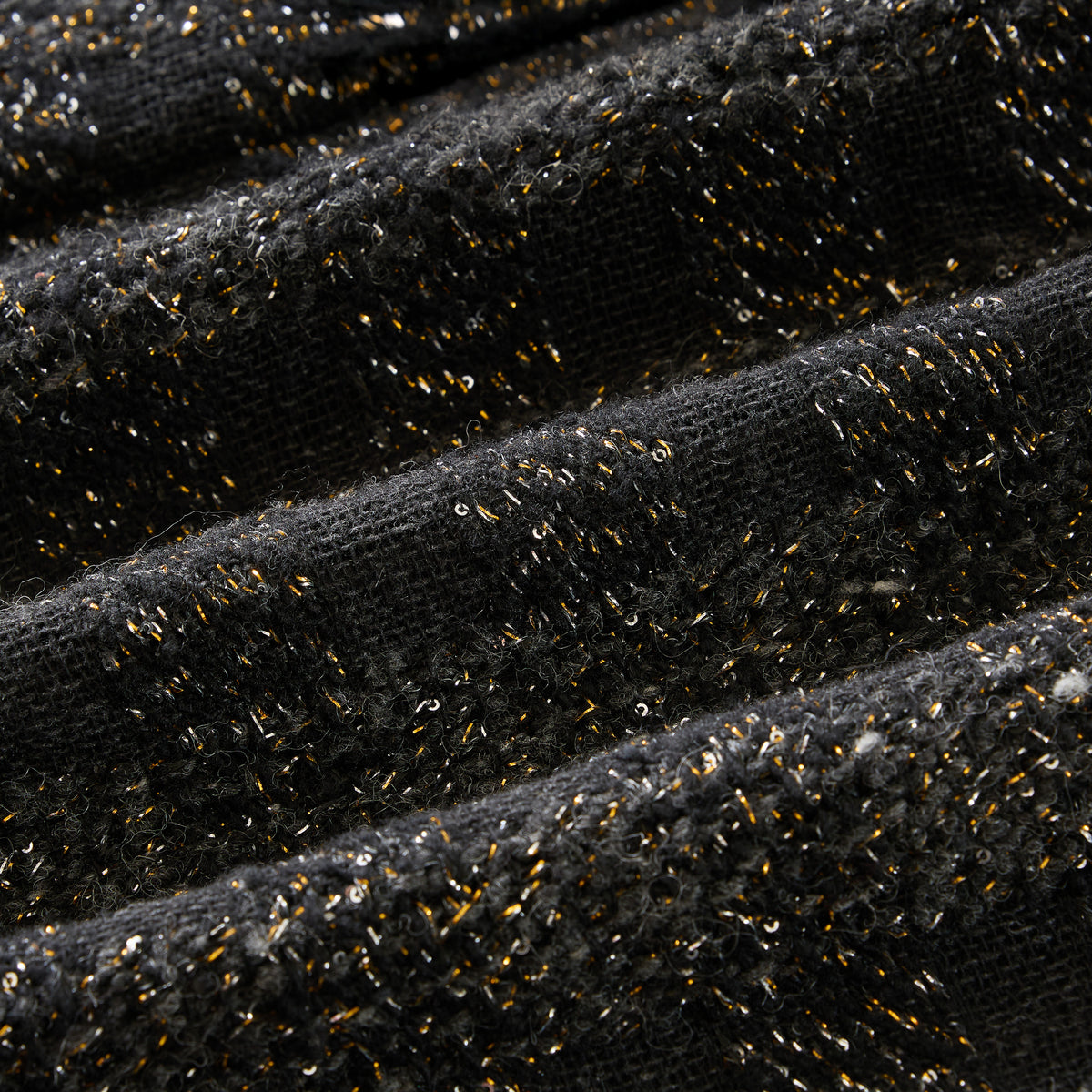 義大利頂級初剪羊毛花呢,以深黑為底織入燦金星點與微光纖維;毛感柔韌蓬鬆、紋理立體,光澤細碎不刺眼。剪裁線條乾淨俐落,讓布面星光隨步伐低調流動。