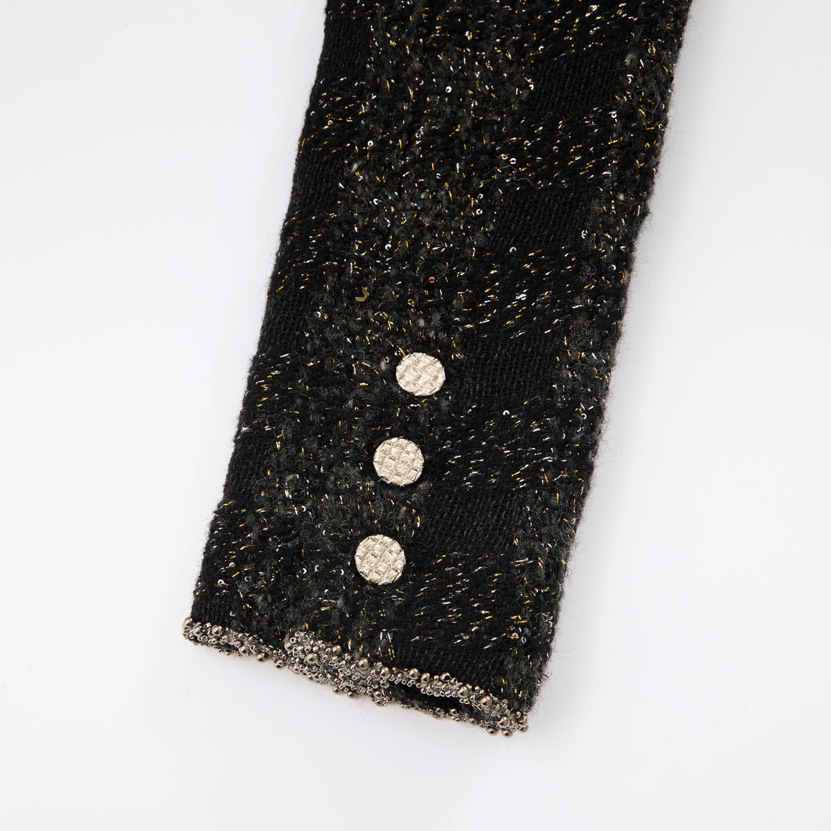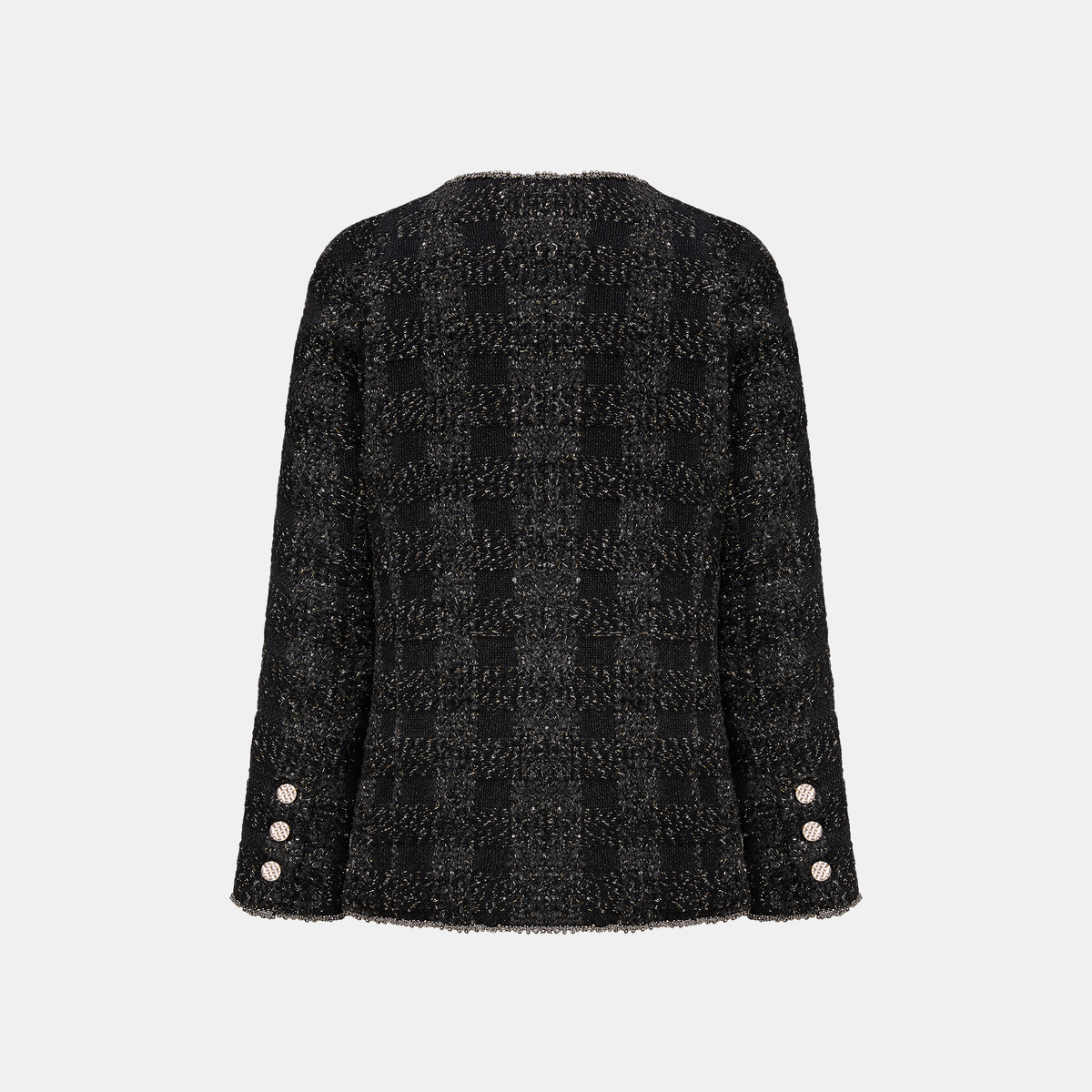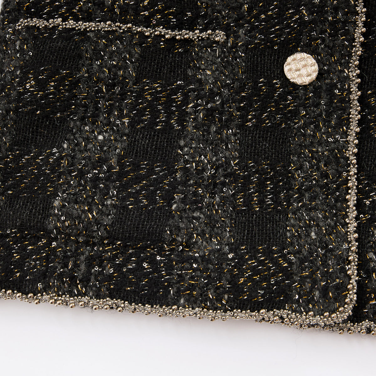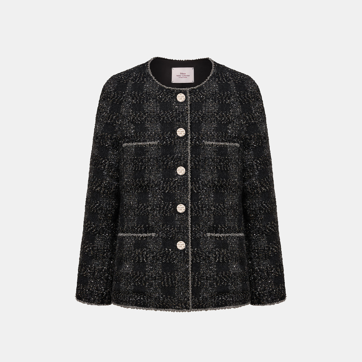 義大利頂級初剪羊毛花呢,以深黑為底織入燦金星點與微光纖維;毛感柔韌蓬鬆、紋理立體,光澤細碎不刺眼。剪裁線條乾淨俐落,讓布面星光隨步伐低調流動。