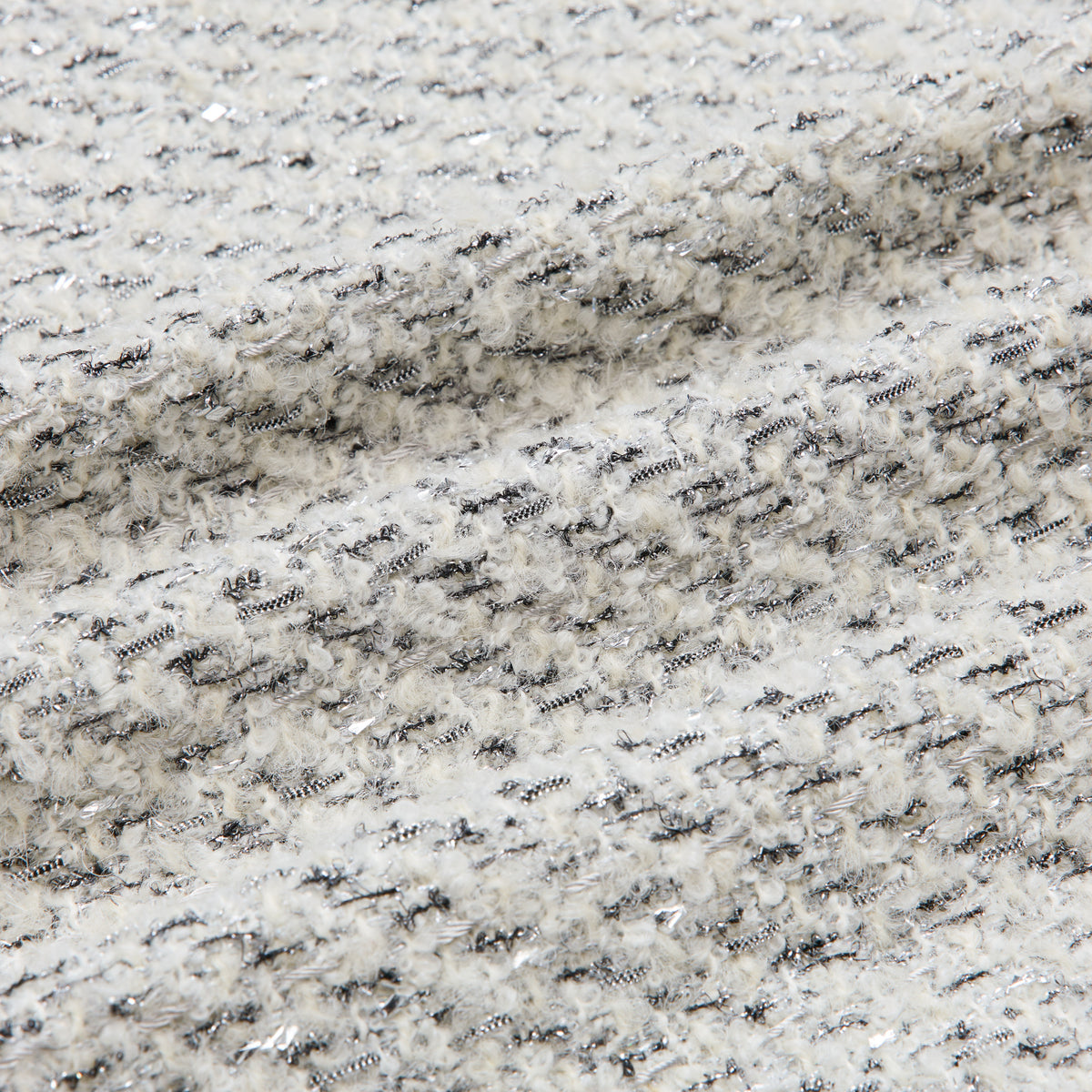 法國高級訂製羊毛蓬圈花呢,以細緻紗圈織就立體肌理,柔軟羊毛纖維在布面層層堆疊,如輕雪覆落。銀織纖維隱隱穿梭其中,隨光線流轉出霧銀光澤,質地溫潤而細膩,呈現沉靜而優雅的冬日層次。