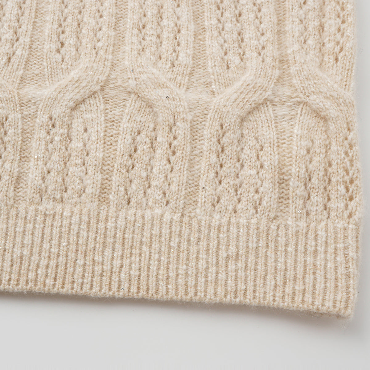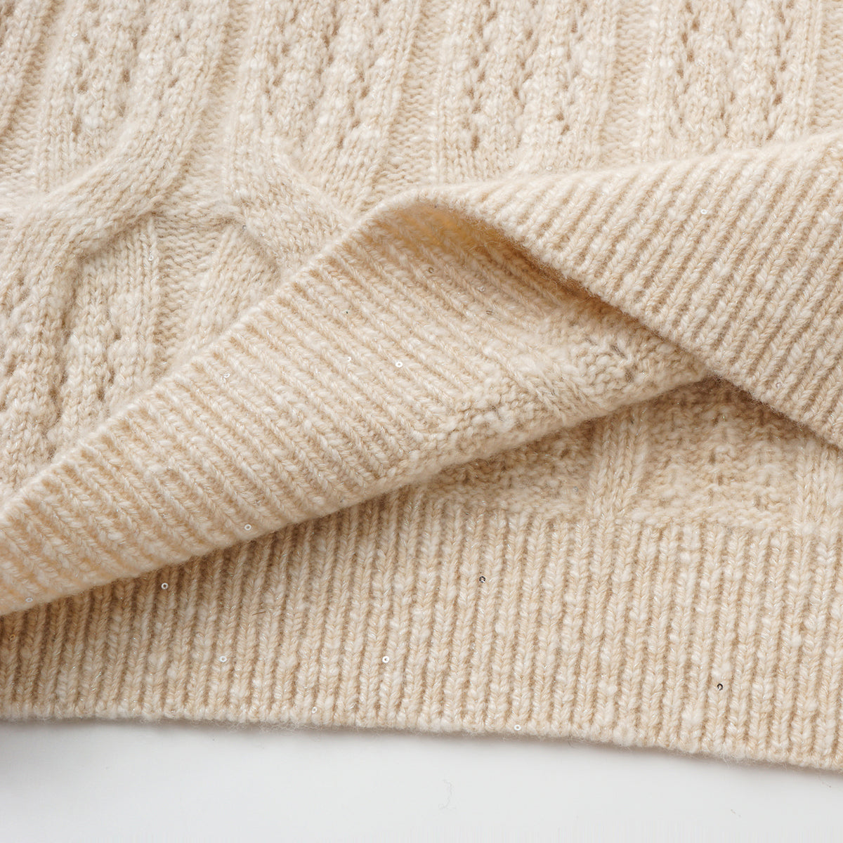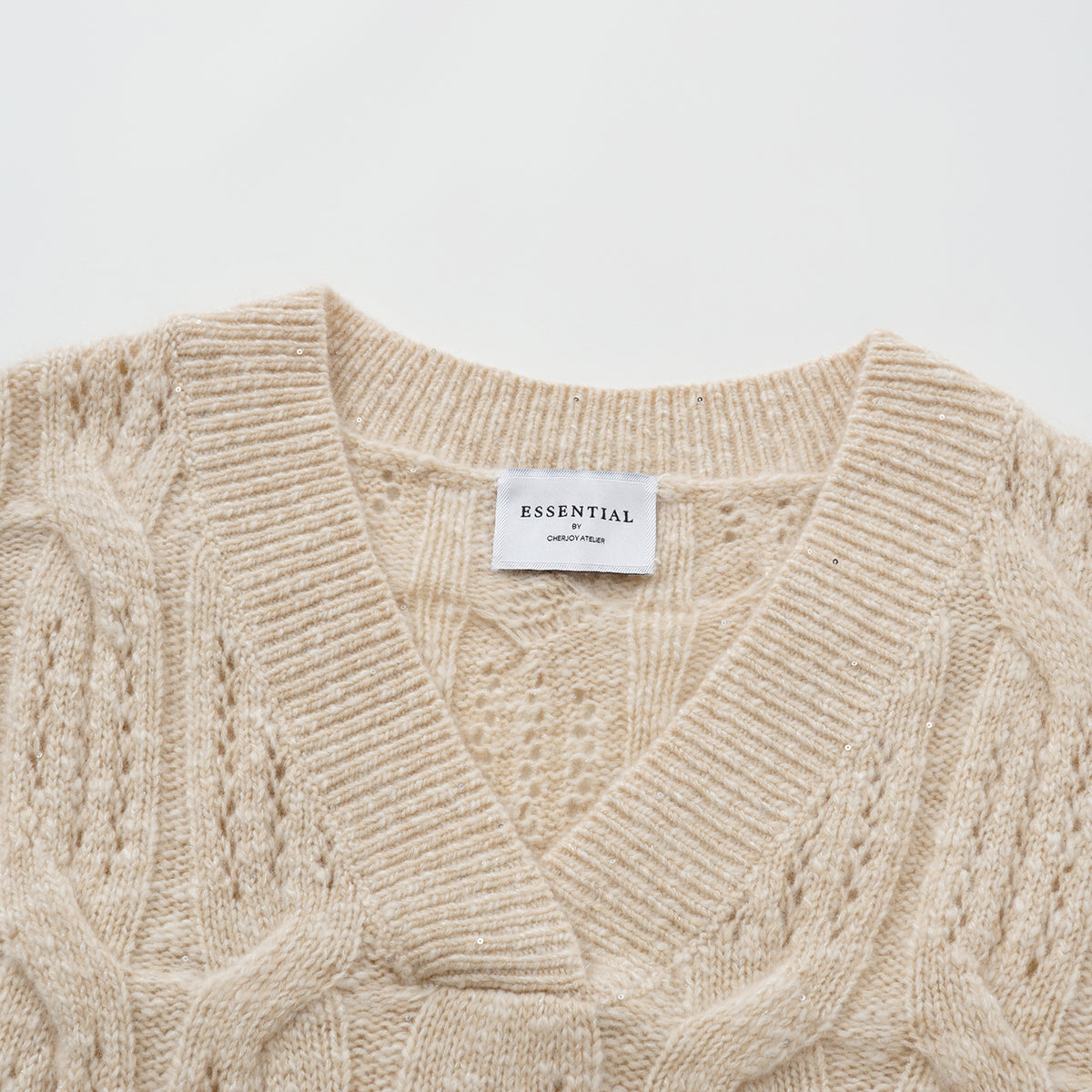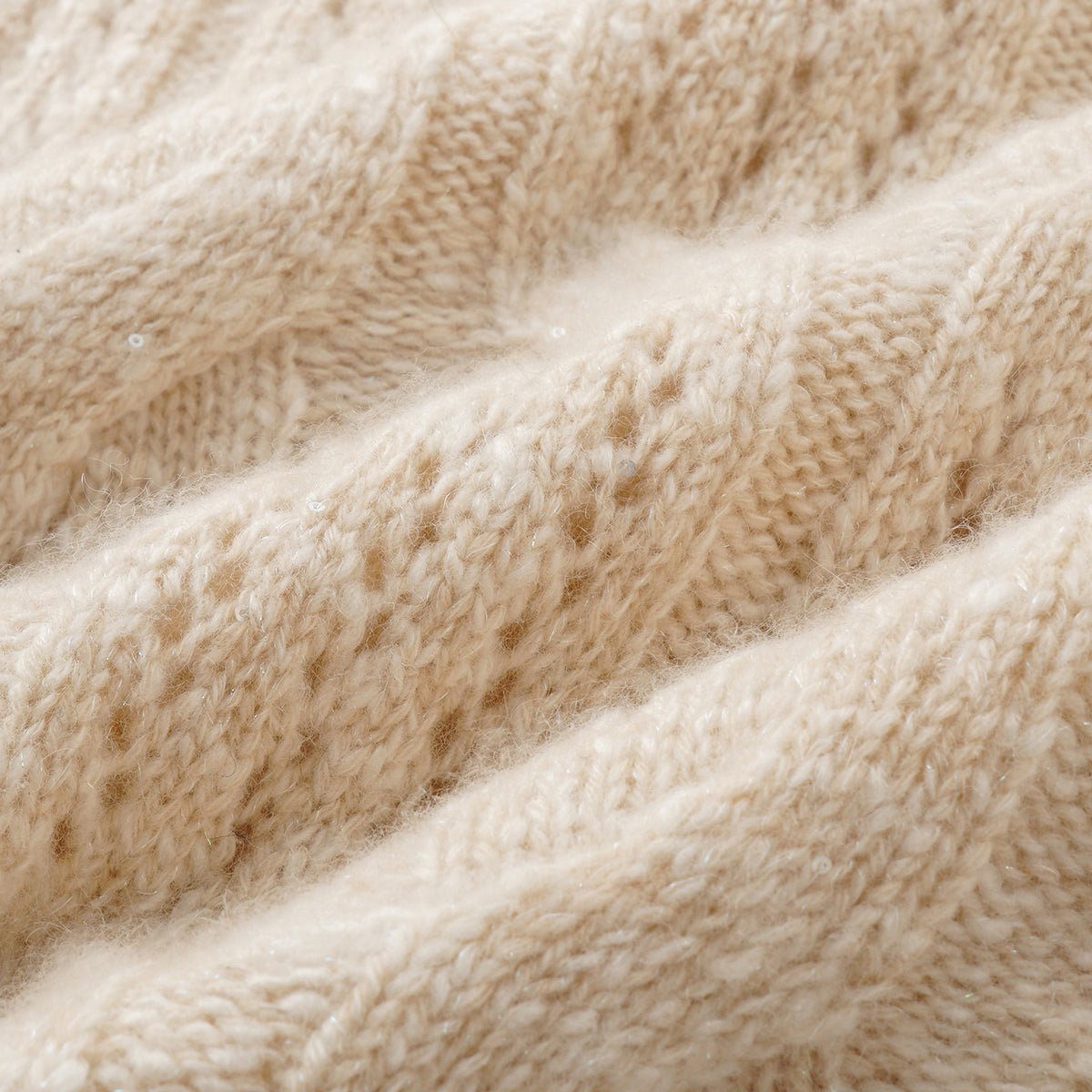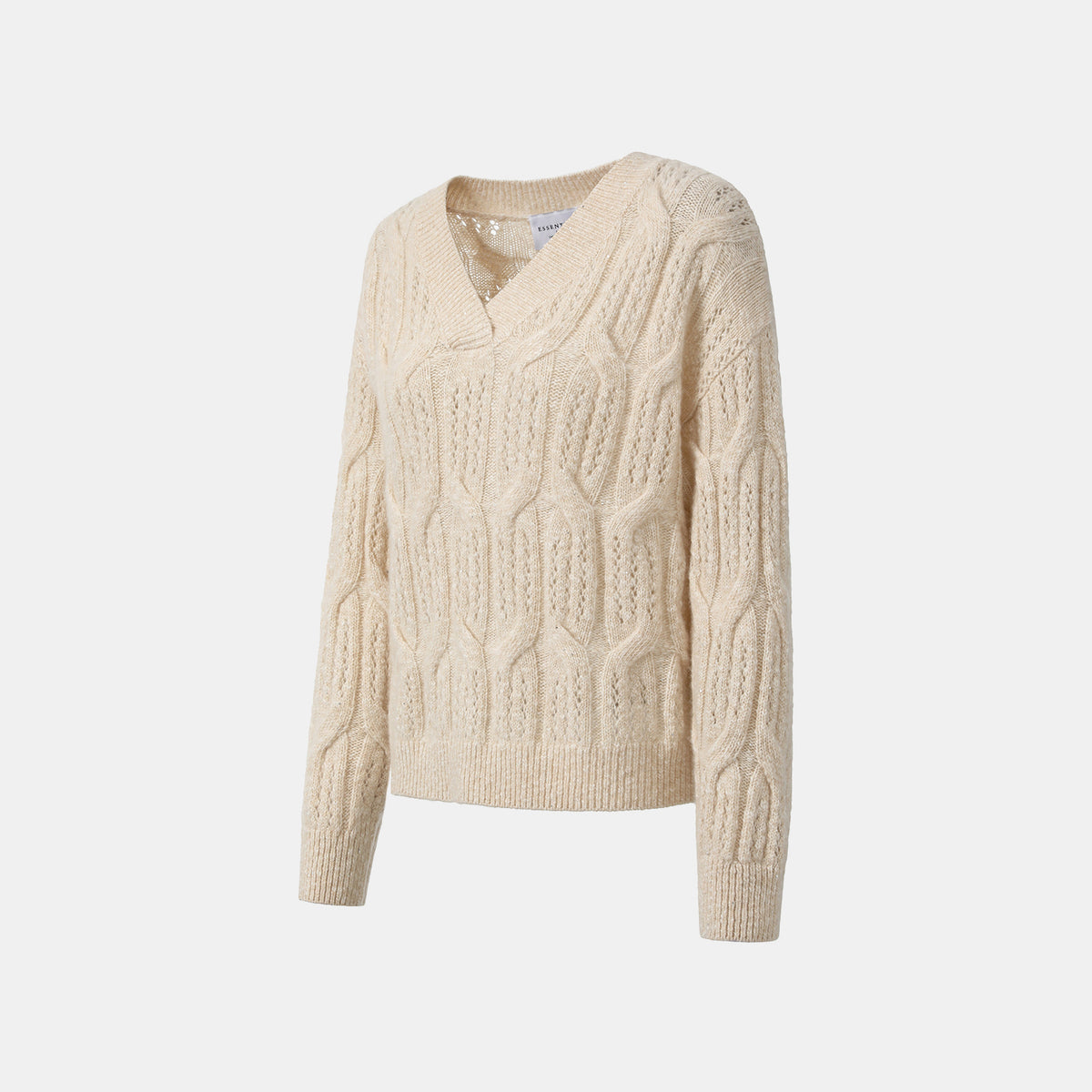“Winter Diary” 100% Cashmere極細絨柔鏤空蜂格紋星點V領上衣—Morning Oat 晨光燕麥