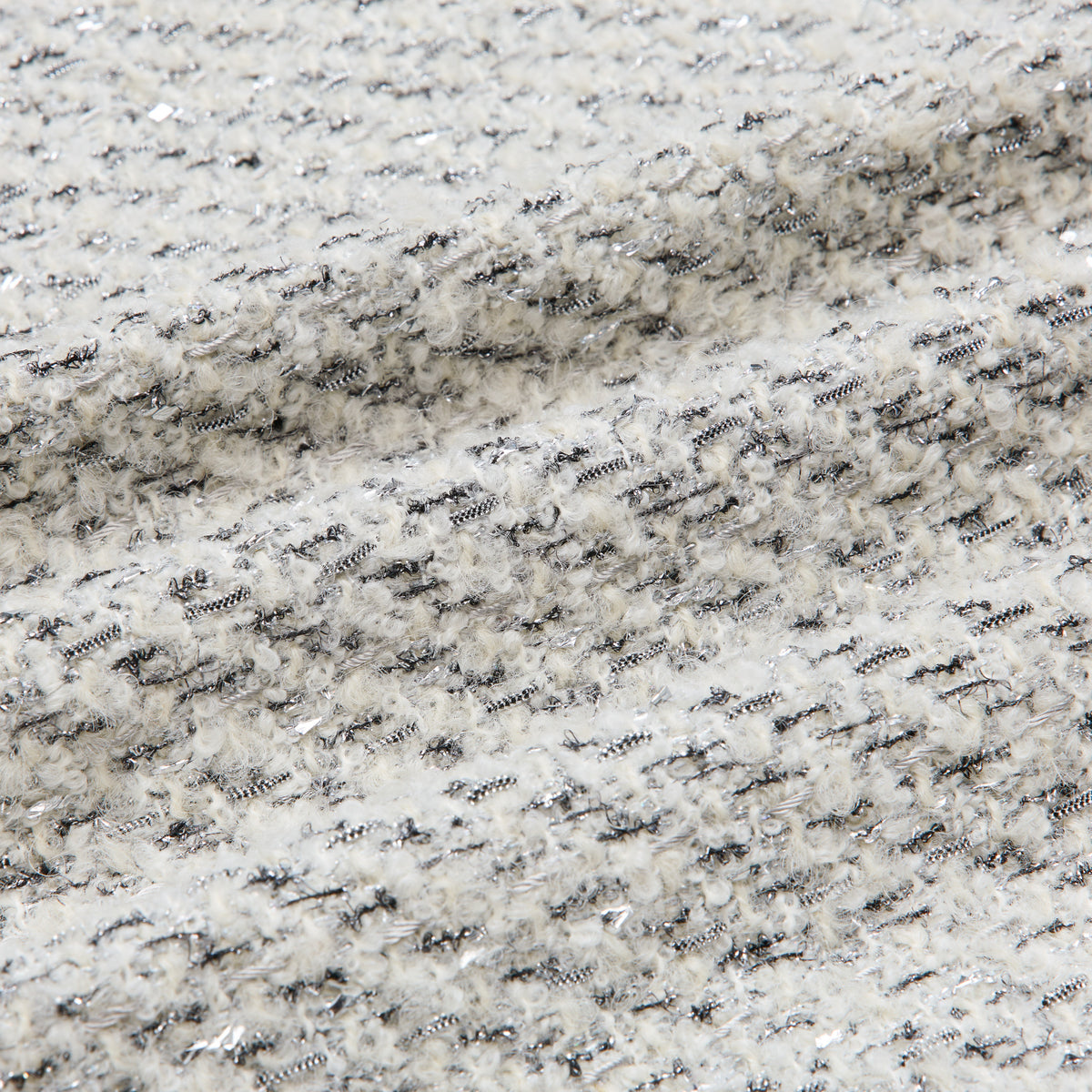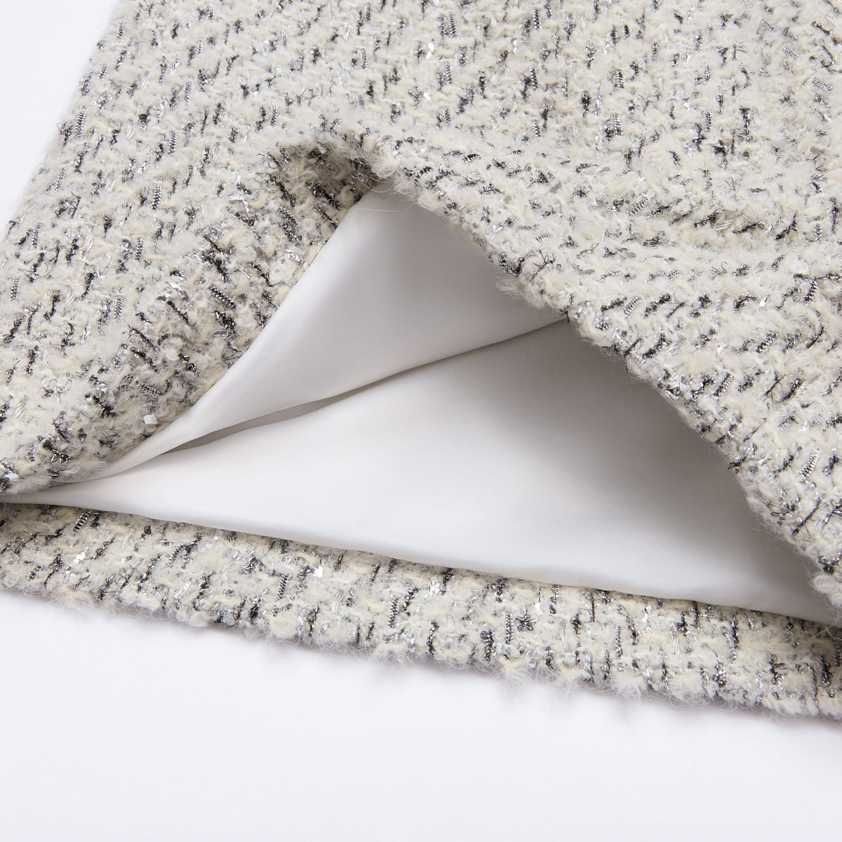 法國高級訂製羊毛蓬圈花呢,以細緻紗圈織就立體肌理,柔軟羊毛纖維在布面層層堆疊,如輕雪覆落。銀織纖維隱隱穿梭其中,隨光線流轉出霧銀光澤,質地溫潤而細膩,呈現沉靜而優雅的冬日層次。