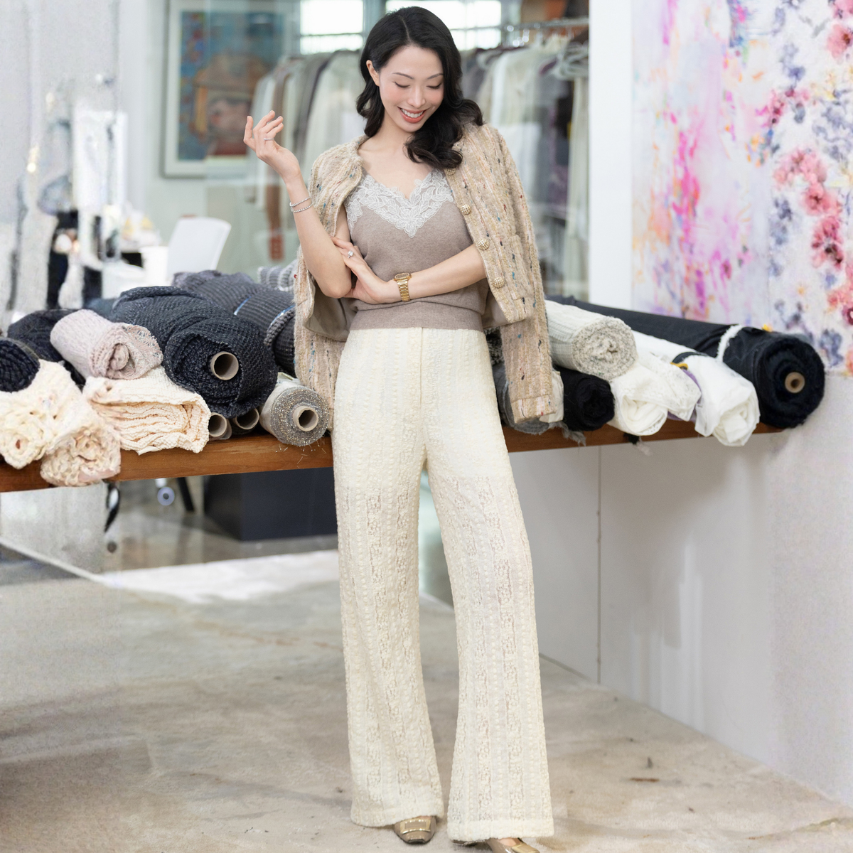 每一塊面料都經過嚴格甄選,部分由我們親自從歐洲頂級百年工坊與面料廠直接採購,部分則從纱線開始,經過挑選、設計與織造,再由專屬工廠完成最後的定型與製作。我們深信,唯有這樣全程把控的流程,才能讓每件作品不僅美麗,還蘊含可被信賴的質感與故事。